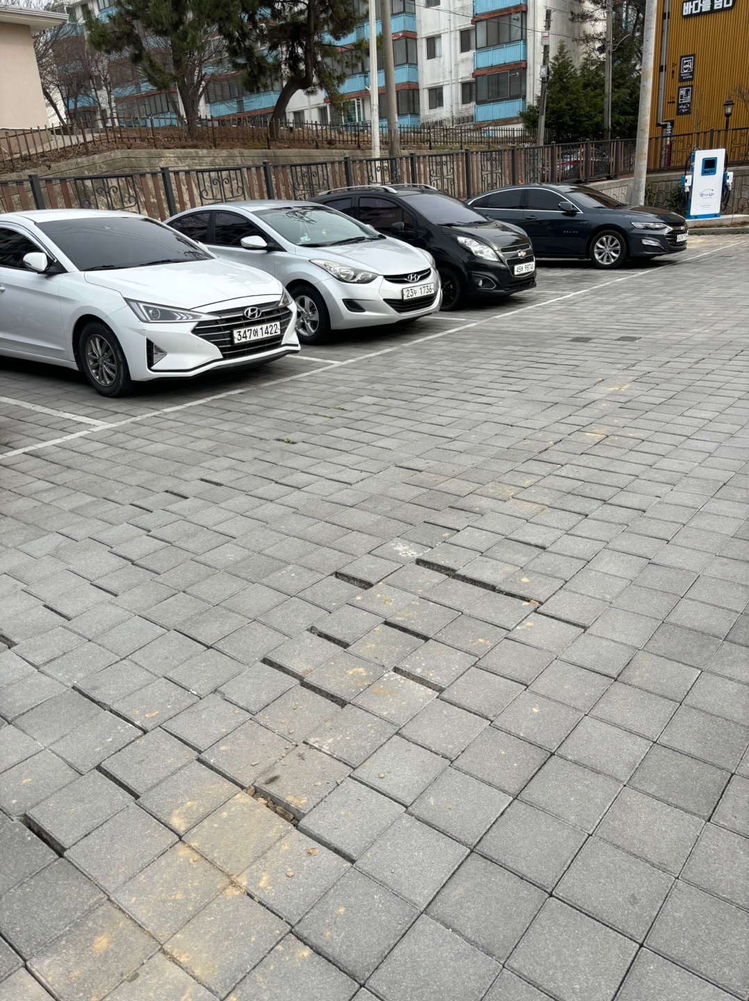 산북동 코오롱아파트 앞에 마련되어 있는 '공영주차장' 바닥이 고르지 못하여 주차하는 시민들이 불편함을 겪고 있습니다.