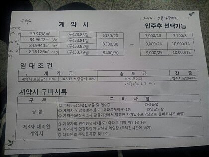 1. 처음 분양시 미분양이 되자 34평A,b형 기준8300만원/30만원을 1억/14만원과 1억2000만원/올전세로 변경해준다고 했으나 분양팀이 임의로 했다며 모르쇠하고 현재는 8127만원/30만원과 1억/19만원으로 불가항력으로 부담하고 있습니다.