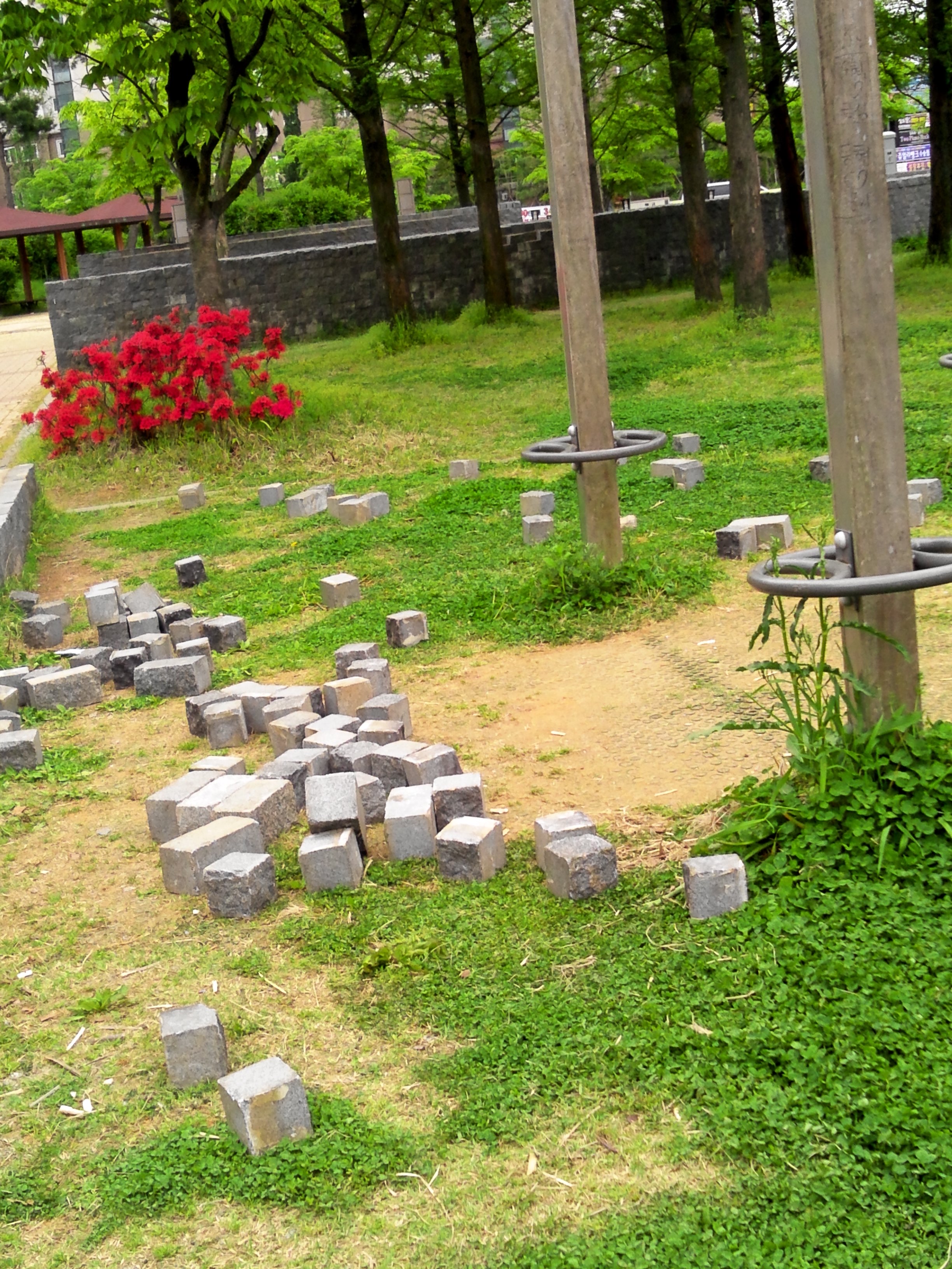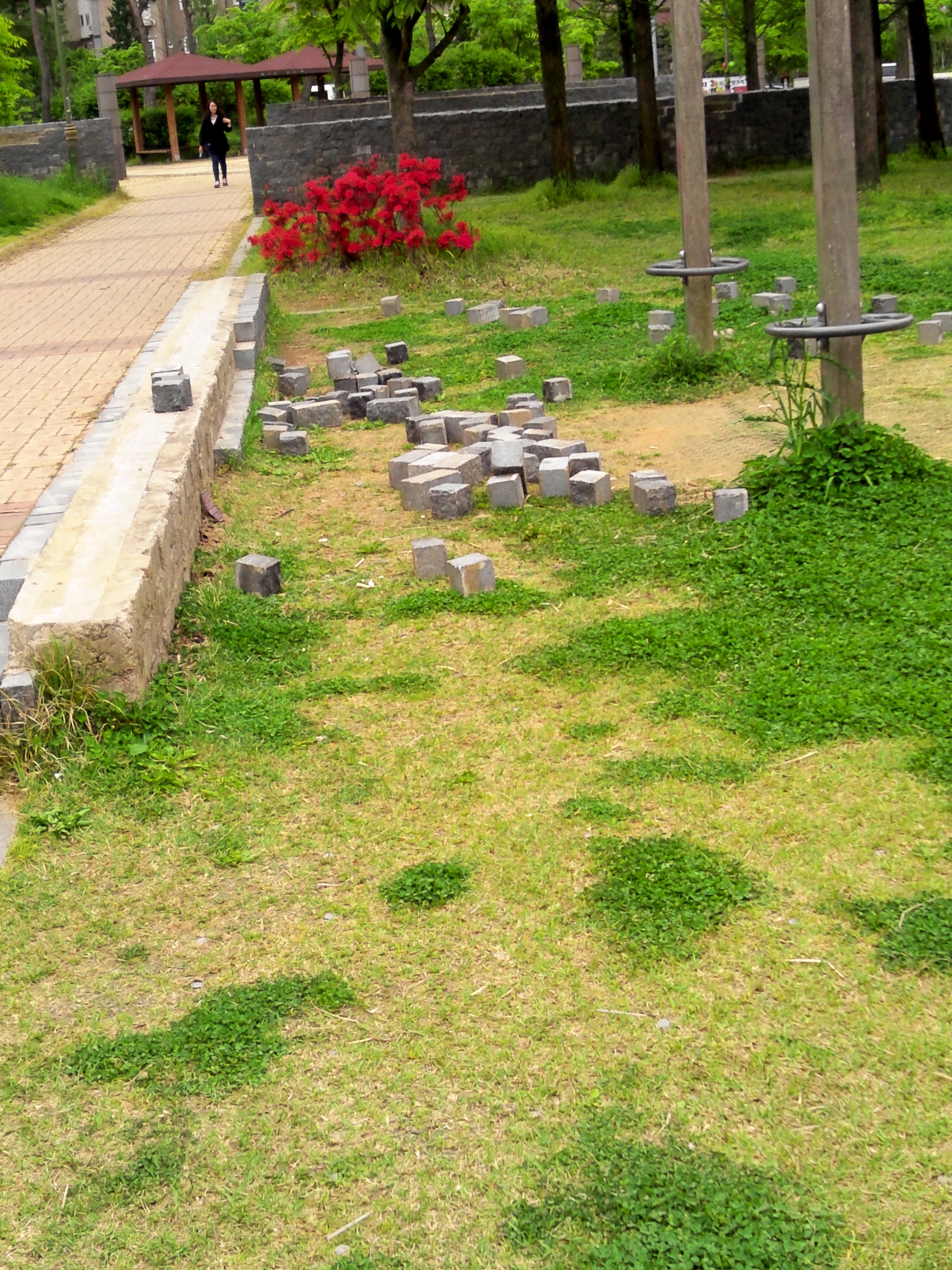 어린 아이들이 저 흩어진 돌을 가지고 노는 모습을 심심치 않게 볼 수 있으며 하루 이틀 사이에 망가진 것이 아닙니다.