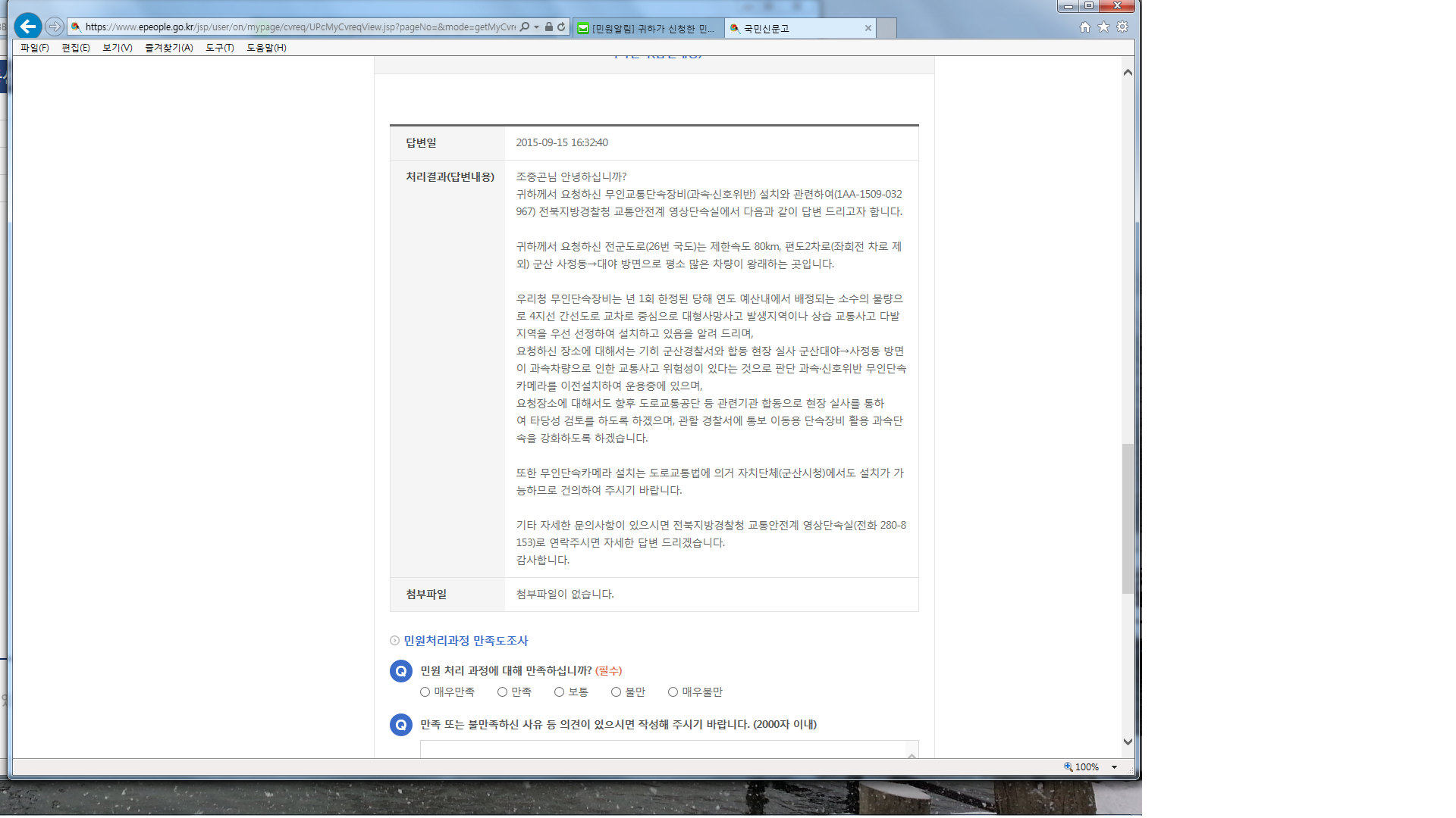 평소 시정 발전에 참여하여 주신 귀하께 깊은 감사를 드립니다. 무인교통단속카메라(속도· 신호위반카메라) 신설 여부는 전북지방경찰청 교통안전시설 심의위원회에서 결정·설치되는 사항이며, 운영권은 전북지방경찰청에 있습니다. 무인교통단속카메라 설치는 경찰청과 지방자치단체에 있으나, 우리시에 교통단속카메라 설치 요청의 지속적인 증가로 많은 재정이 소요되어, 열악한 지방재정으로 인해 예산을 확보하는데 어려움이 있습니다. 많은 양해 바라며 귀하께서 요구하신 지점은 전북지방경찰청에 타당성 검토 및 설치 건의토록 하겠습니다. 자세한 문의사항은 아래를 참고하시어 문의하여 주시면 성실히 답변드리겠습니다. ※ 전북지방경찰청 경비교통과(무인영상실) ☎ 280-8153 ※ 군산시청 교통행정과 ☎ 454-7912 |