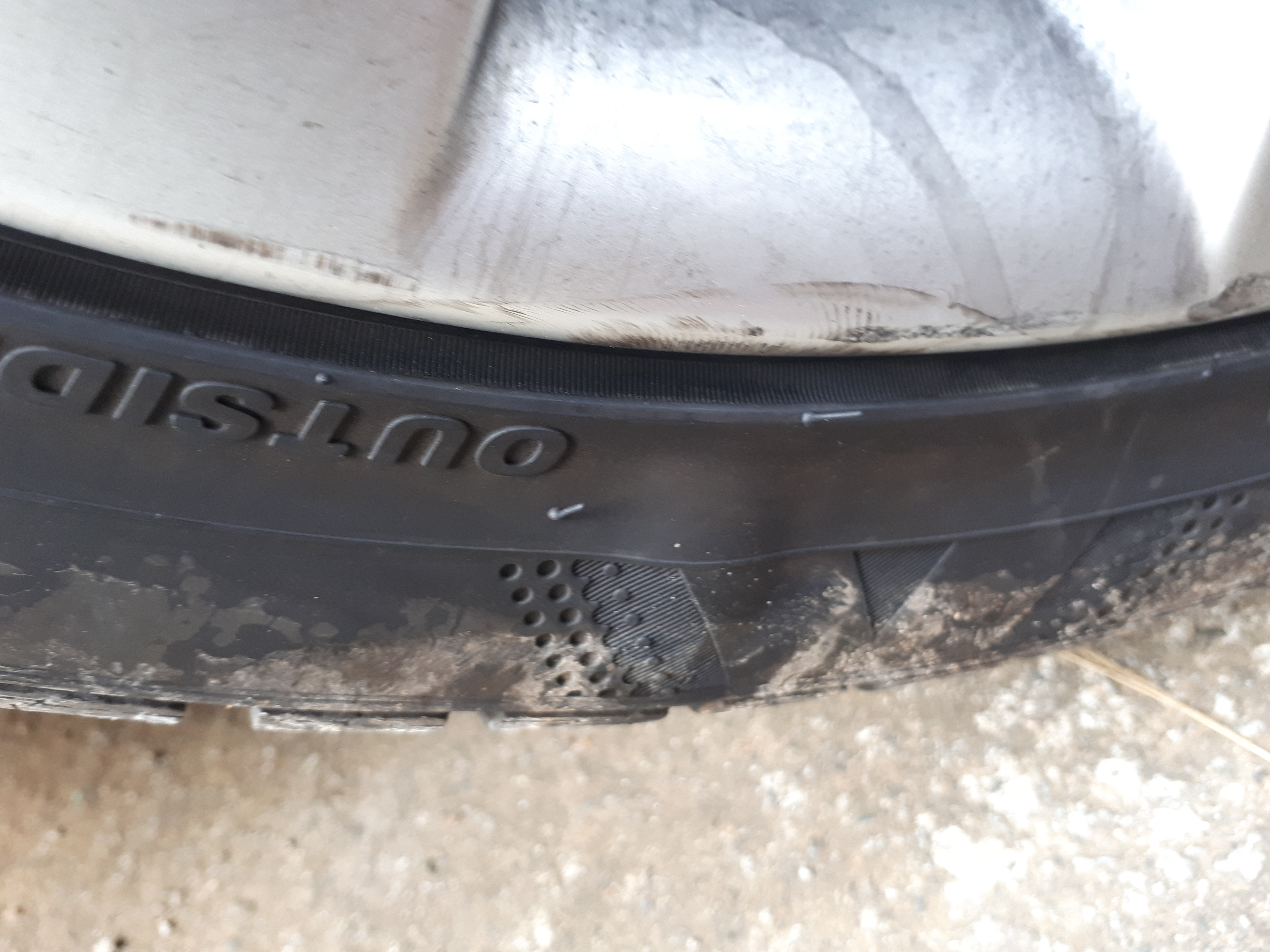 손상부위는 운전석 앞쪽 휠기스와 타이어 갈라짐,, 운전석 뒤쪽 휠기스와 타이어기스