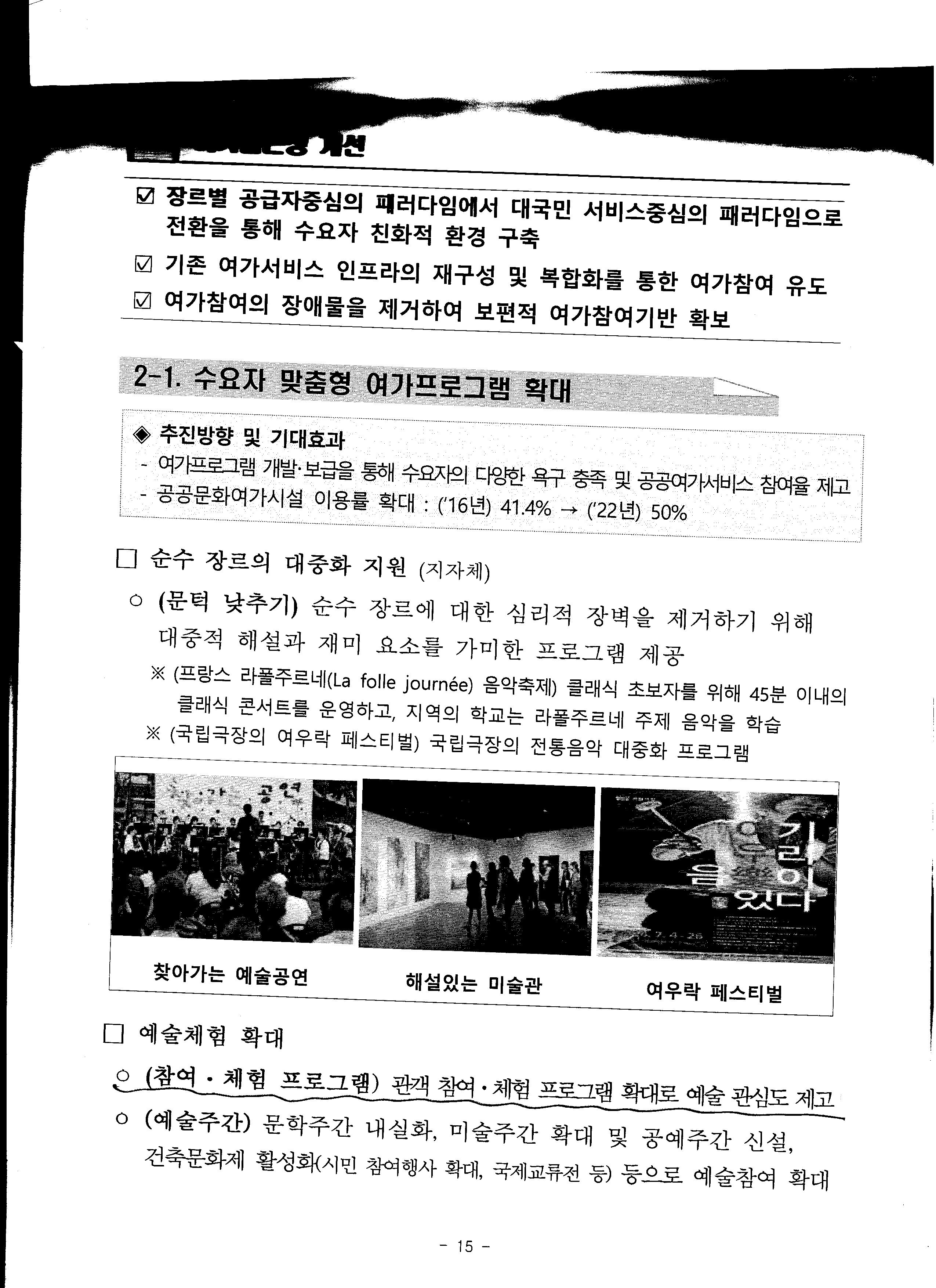 1. 문체부 국민여가 활성화 기본계획에 의거 예술체험, 참여 프로그램 확대 시행이 있는바
