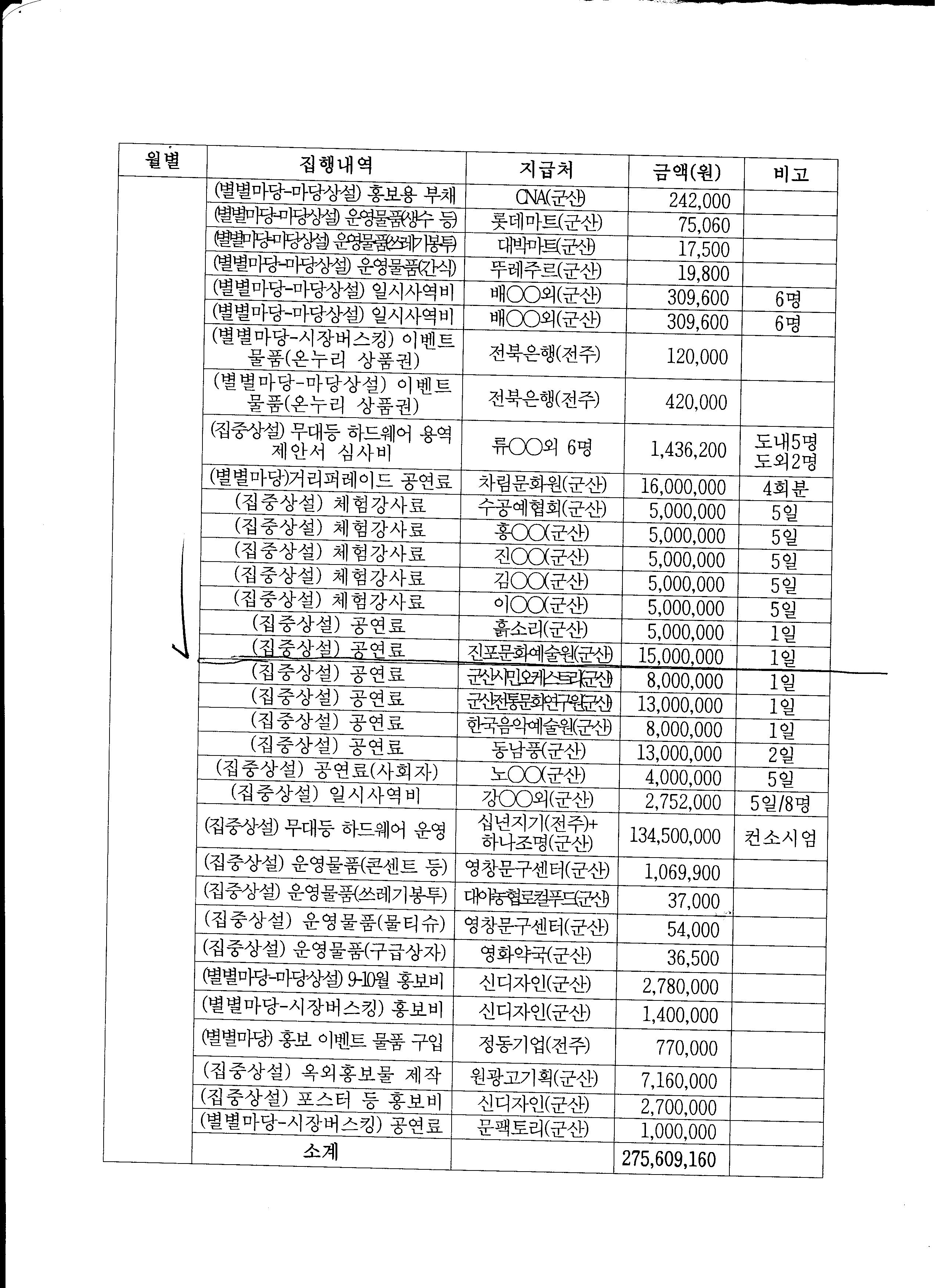 1. 군산근대역사문화 상설공연 총 6억원 중 1억 5천만원 정도만 1차로 재단 홈페이지에 공개후 일