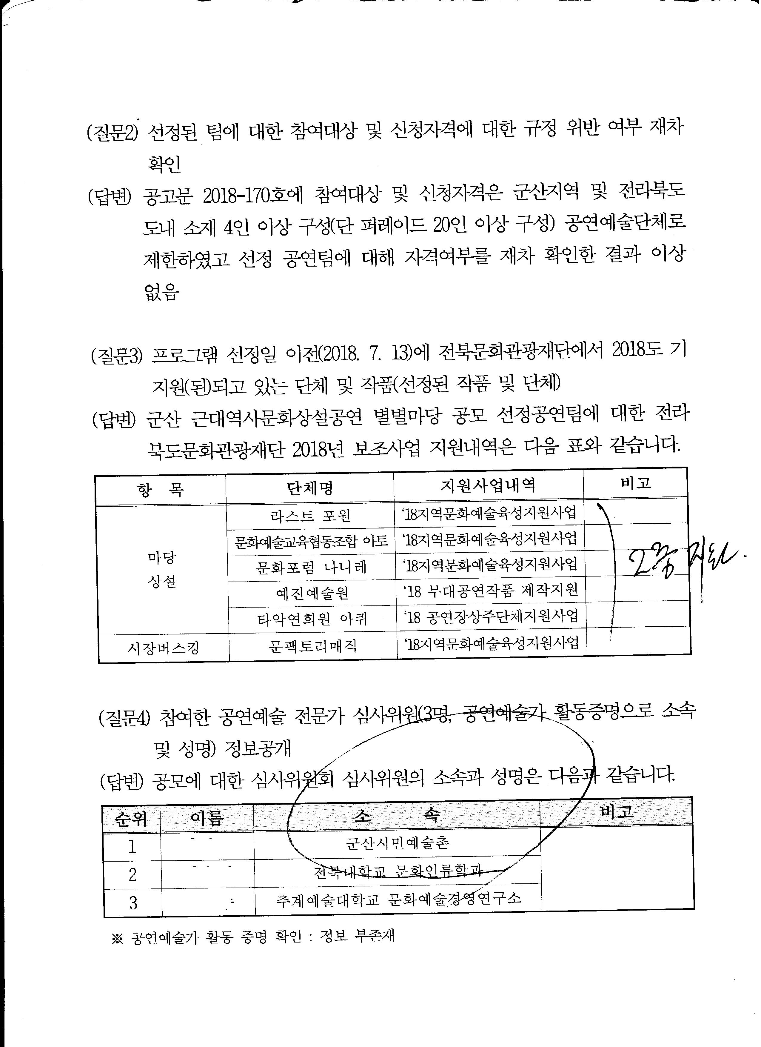 여개 이상이 됩니다. 2018년도 군산시 예술단체 총지원금액 예 50억, 또는 100억등 공개요구)