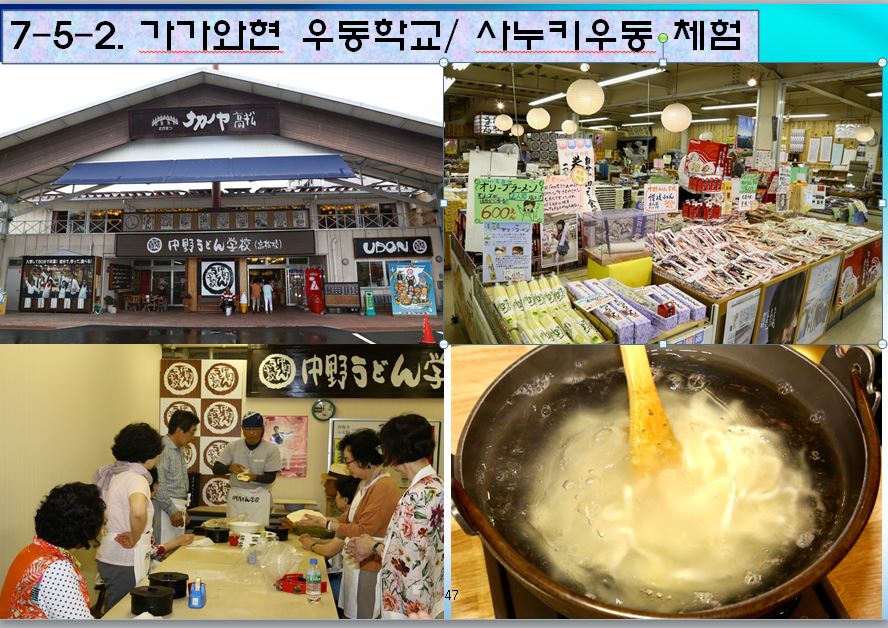 5. 우리나라 농촌체험이 대부분 고구마캐기 옥수수따기 사과따기 딸기따기체험등 체험을 위한 단순 농사체험상품을 운영하는 경우가 많은데 가가와현의 우동만들기체험처럼 2층에서 우동체험과 식사를 한 후 밀대를 기념품으로 주면 1층으로 내려와서 수백종의 6차상품이 진열된 로컬푸드직매장에서 일본밀가루, 육수용멸치, 장아찌반찬