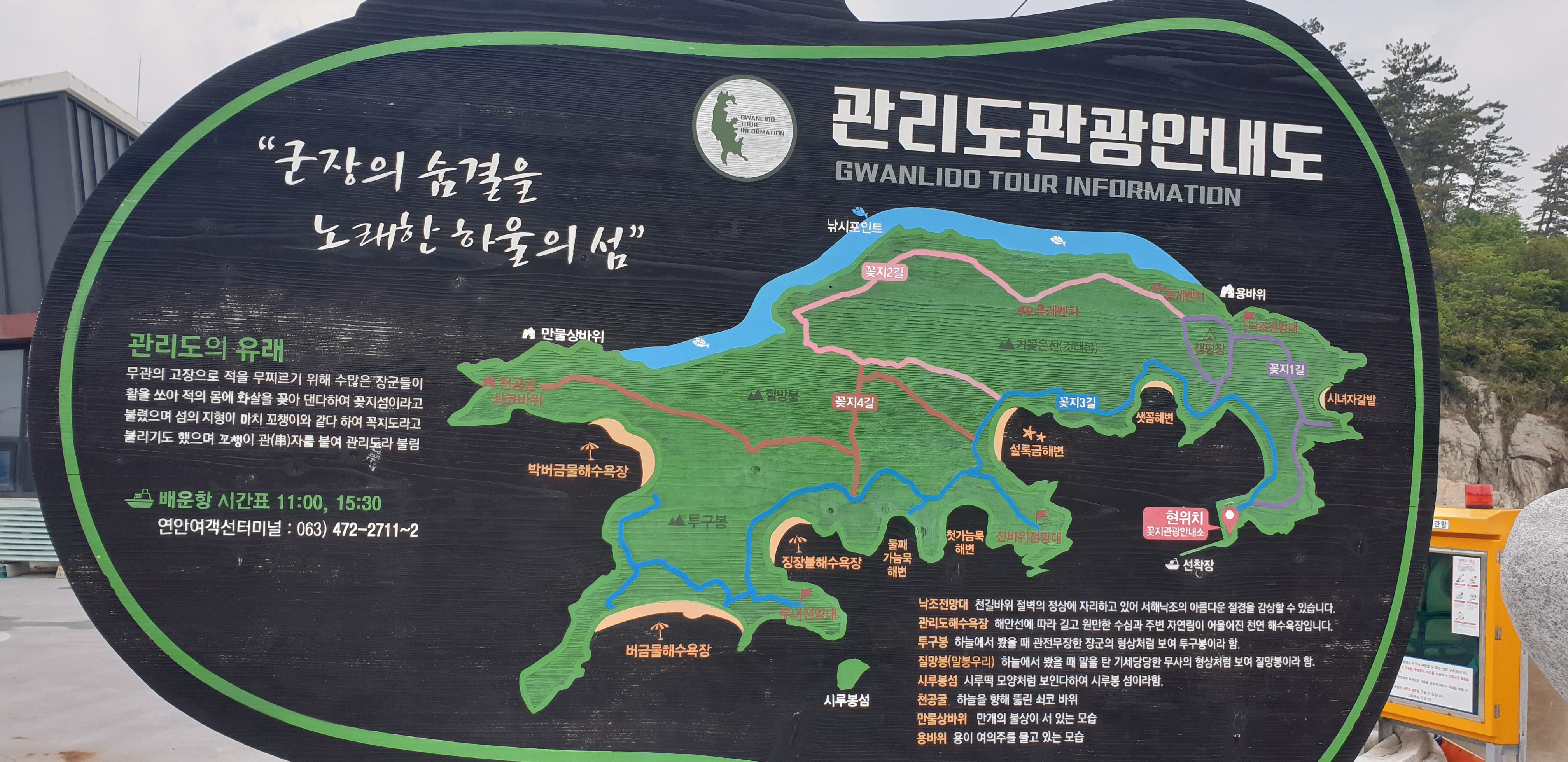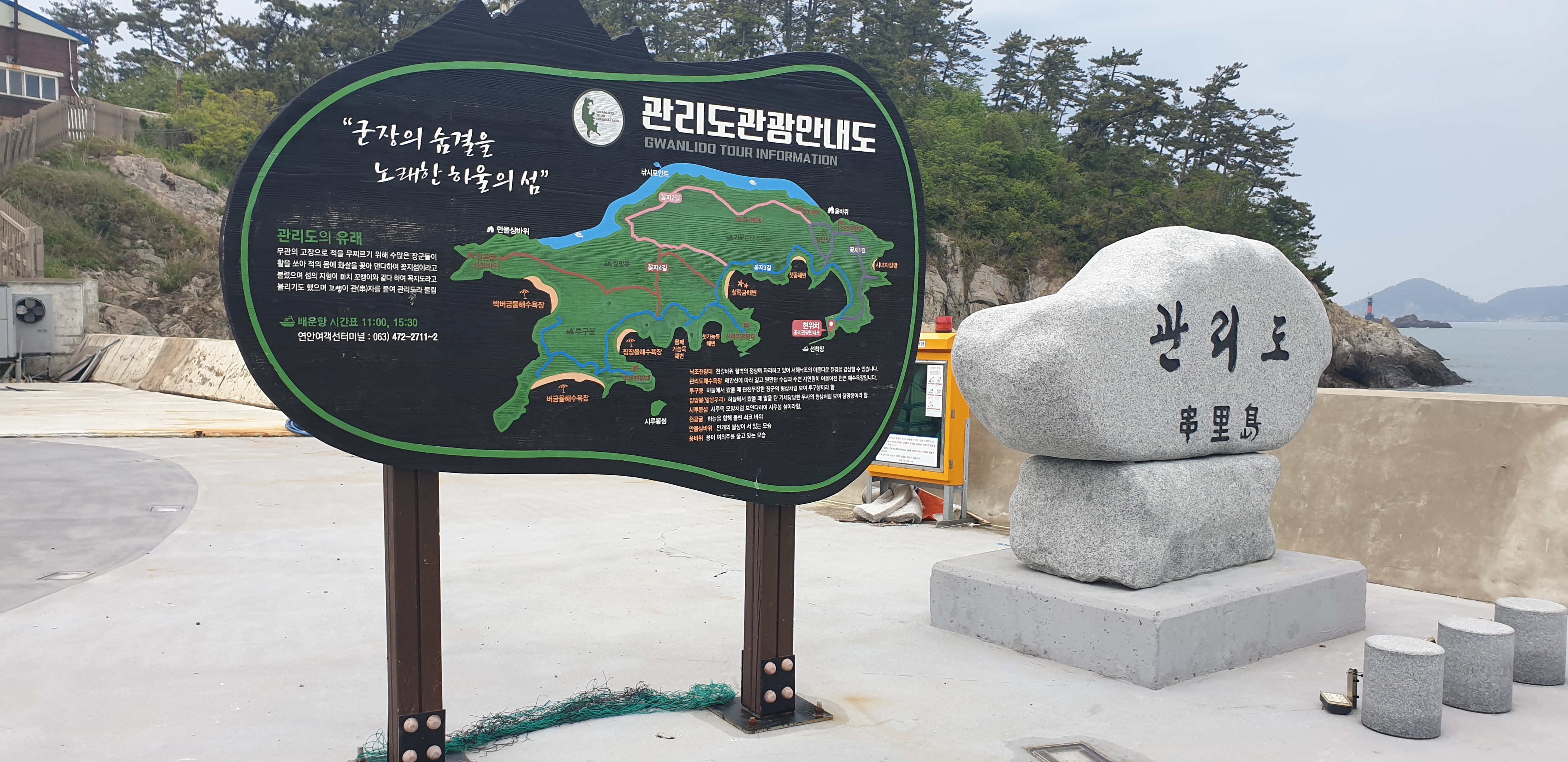 관리도 입구에 관관안내표지판에 여객선 시간표가 11:00, 15:30, 하루 2편으로 표기되어 있습니다.