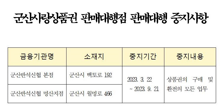 | 113 | 군산사랑상품권 판매대행점 판매대행 중지사항 |