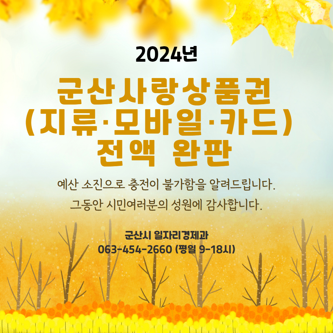 군산사랑상품권(지류,모바일,카드) 예산 전액 소진으로 충전이 불가합니다.