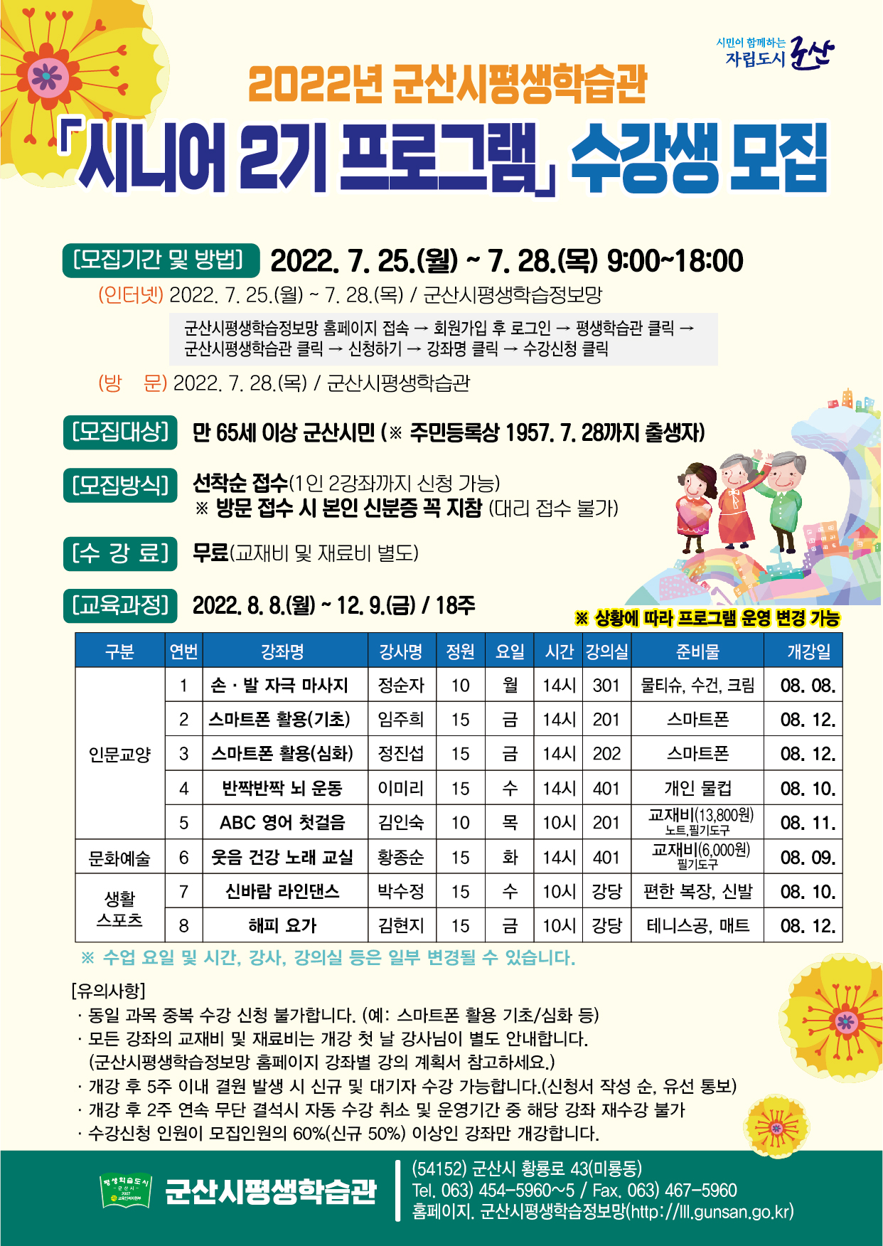 영위하는데 기여하고자『2022년 군산시평생학습관 시니어 2기 프로그램』수강생을 다음과 같이 모집하오니 관심