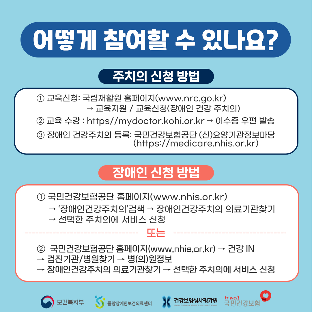 건강관리를 위한 장애인 건강주치의 3단계 시범사업을 시행하고 있으니 많은 홍보 바랍니다