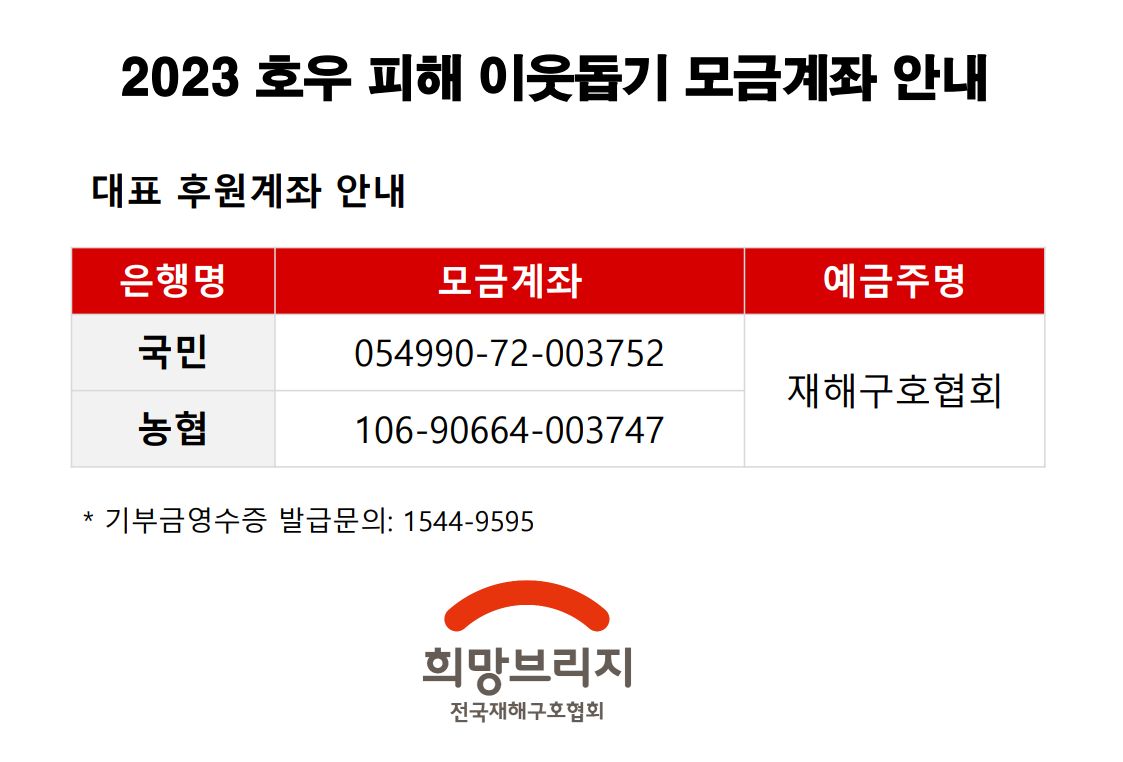 ※ 기부금 영수증 발급 등 문의전화 : 1544-9595(전국재해구호협회)
