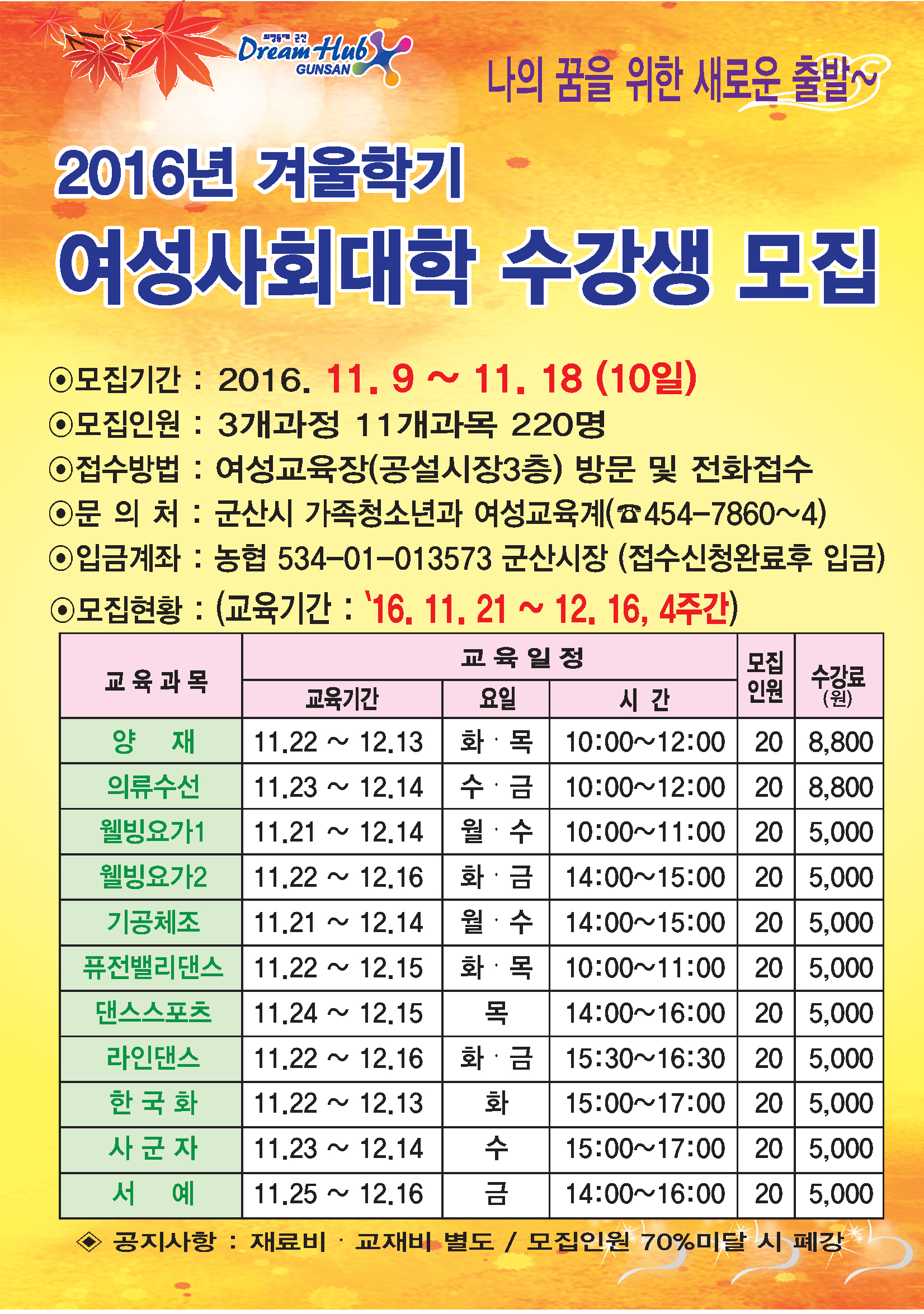 ❍ 문 의 처 : 군산시 가족청소년과 여성교육계(☎454-7860~4)
