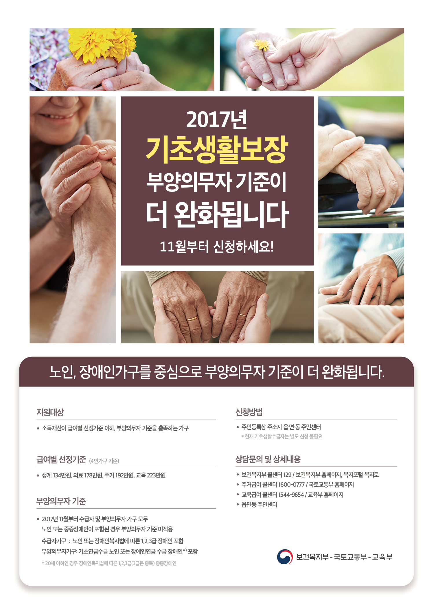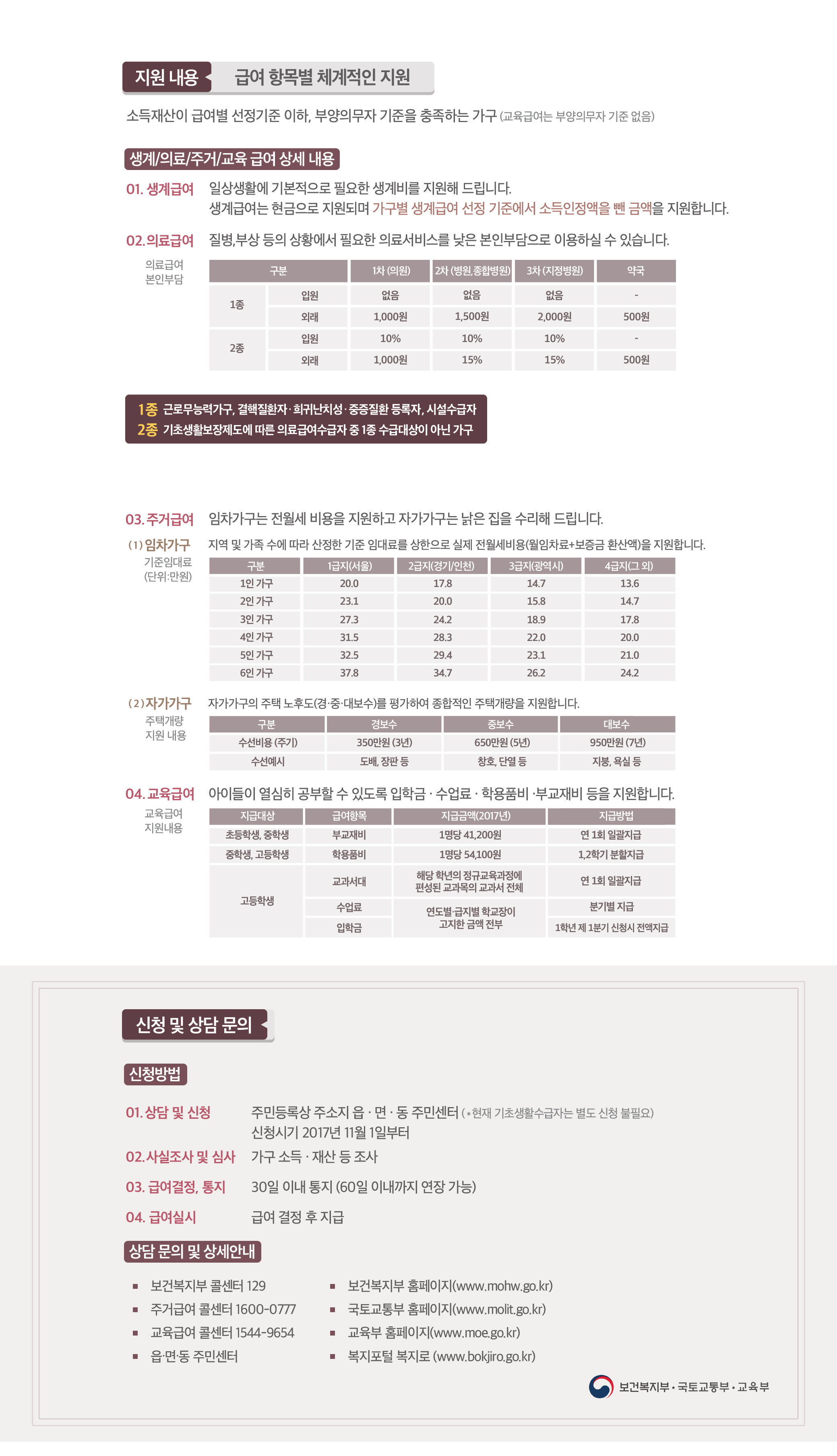 보건복지부 콜센터 129, 주거급여 콜센터 1600-0777, 교육급여 콜센터 1544-9654, 읍면동 주민센터