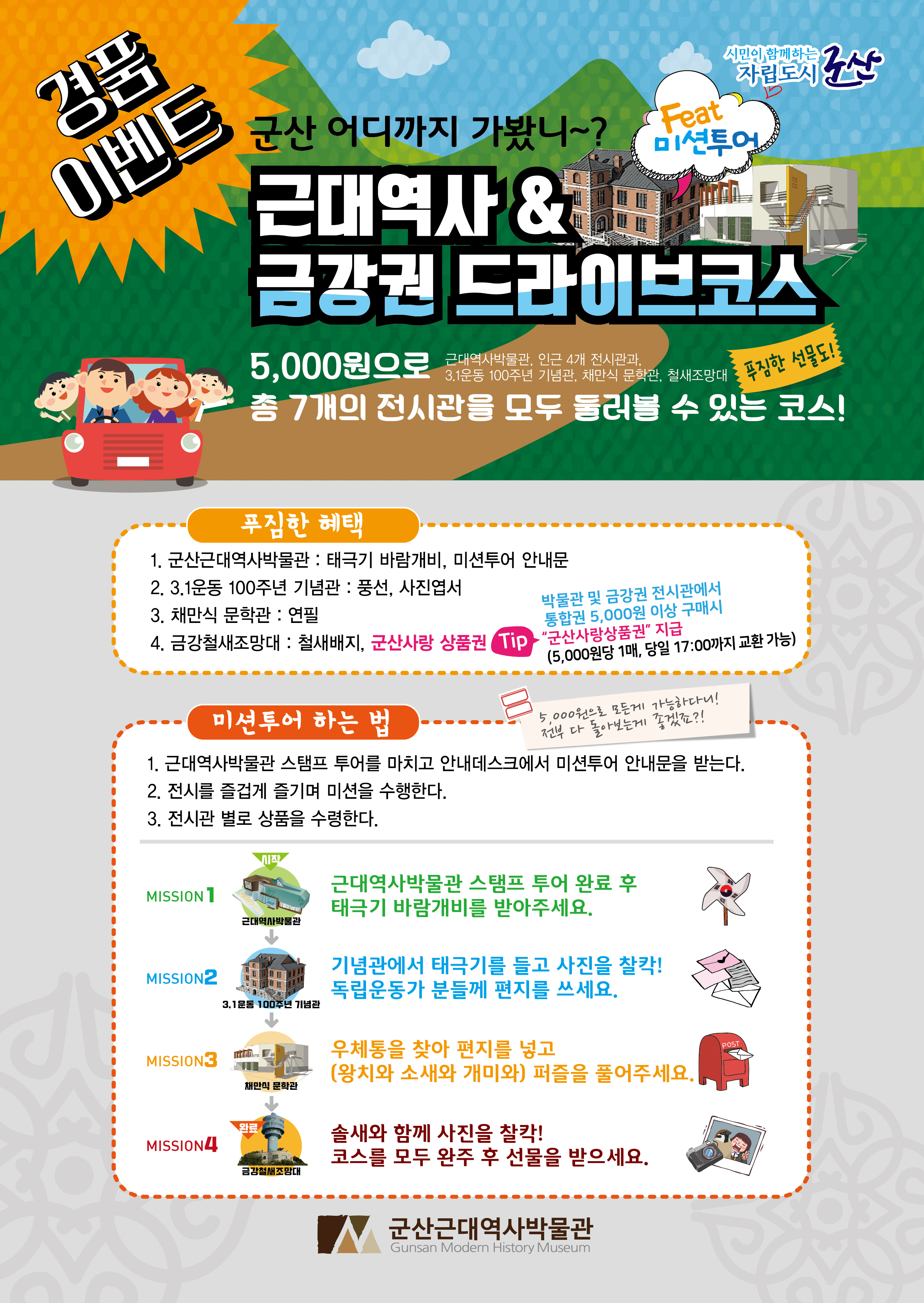 각 전시장에는 미션도 숨어져있는데, 미션을 완료하시는 분들께는 선물을 증정하는 이벤트도 함께 진행하고 있으며, 각 전시장마다 현장학습지도 마련되어 있어, 대한민국의 역사를 배우는 학생들과 역사를 새롭게 접하는 어른들에게도 뜻깊은 관람이 될 것입니다.