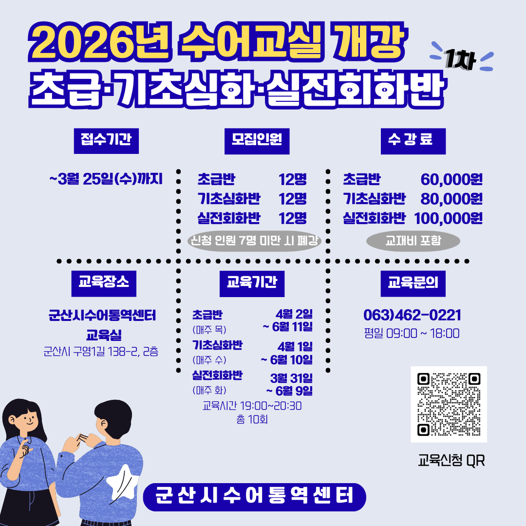 - 교육장소: 군산시수어통역센터 교육실 (군산시 구영1갈 138-1, 2층)