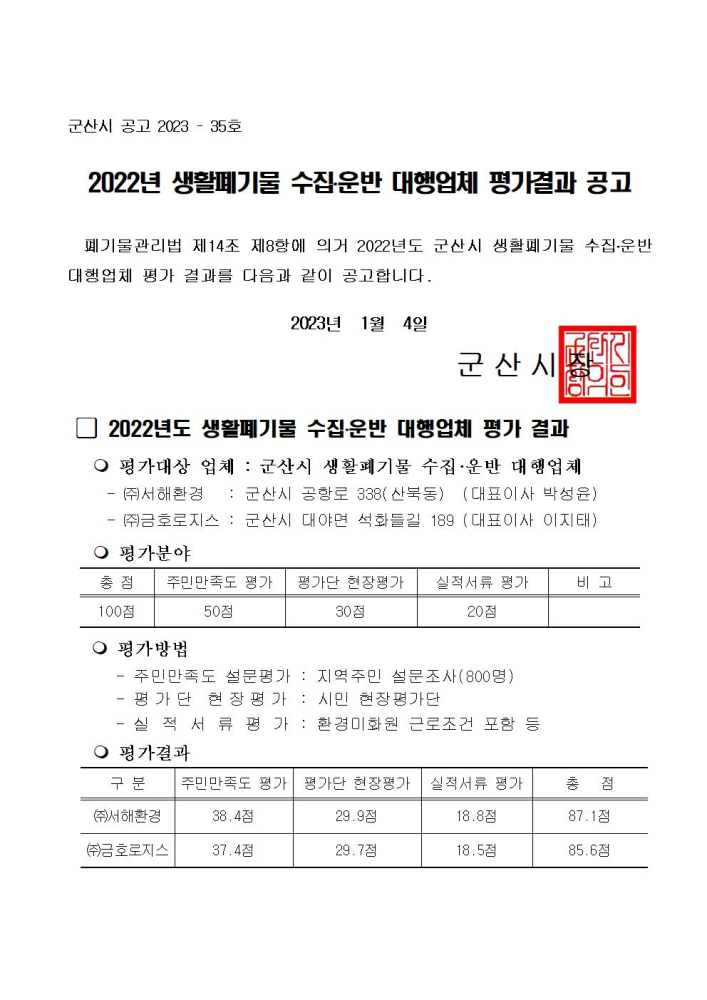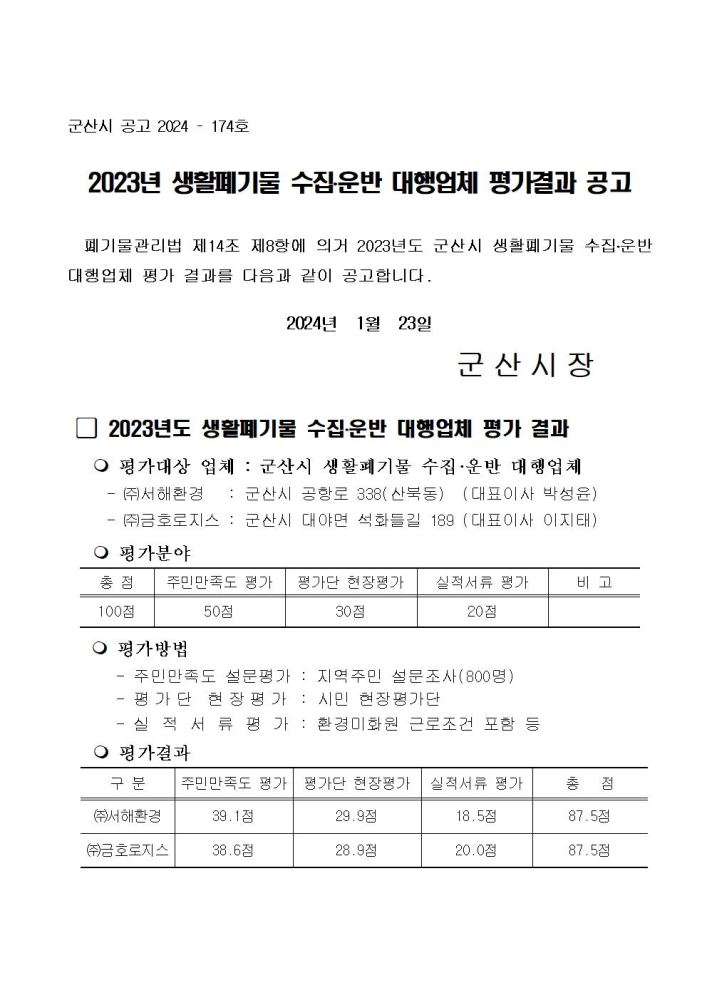 | 46 | 2023년 생활폐기물 수집․운반 대행업체 평가결과 공고 |
