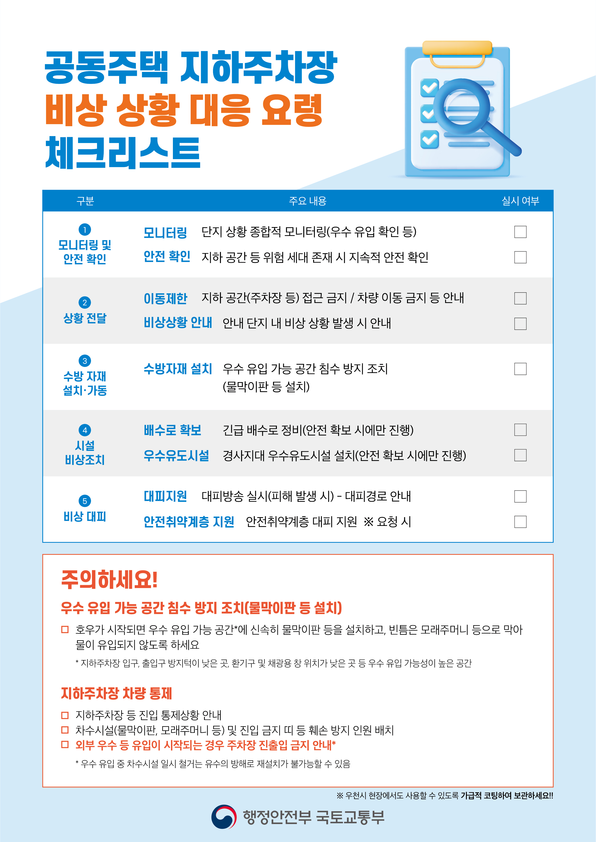 호우, 장마, 태풍 등 재난대비 공동주택 내 상황발생에 따른 단계별 조치사항, 요령 등을 기재한 사항입니다.(지침)