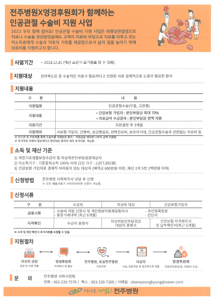 | 2121 | 건강나눔영경후원회 '2023 우리 함께걸어요! 인공관절 지원사업' 추가지원 안내 |