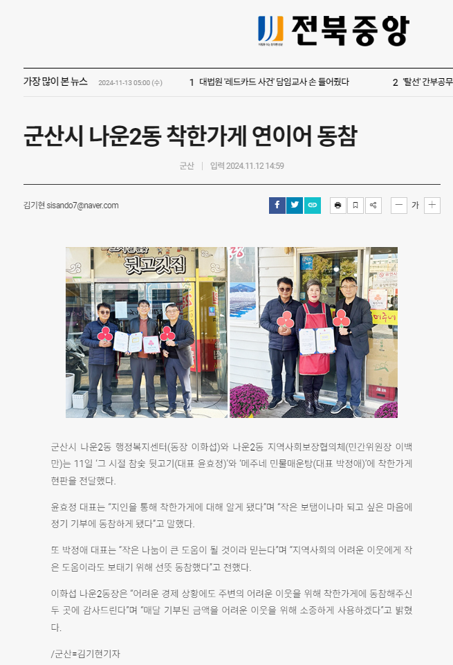 | 2715 | 군산시 나운2동 착한가게 연이어 동참 |