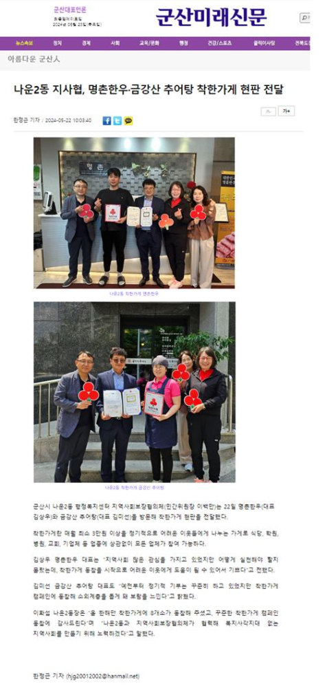 | 2511 | 나운2동 지사협, 명촌한우 · 금강산 추어탕 착한가게 현판 전달(보도자료) |