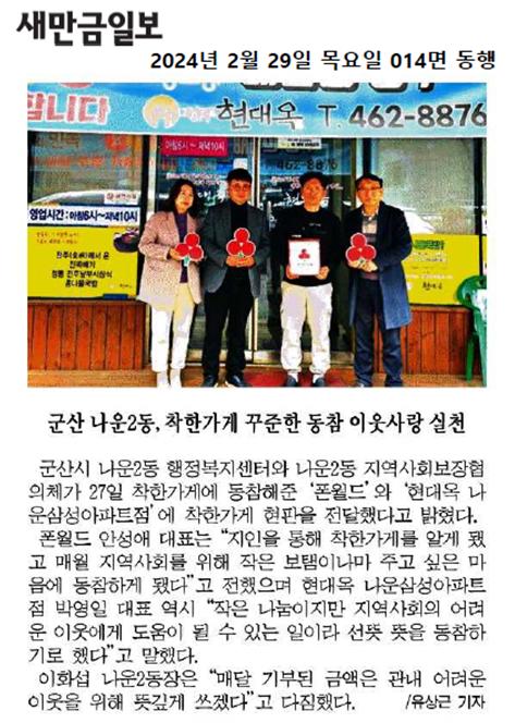 | 2350 | 현대옥(나운삼성아파트점), 폰월드 착한가게 현판식 보도자료 |