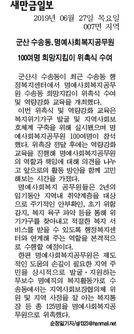군산시 수송동(동장 김경배)에서는 25일 수송동 행정복지센터에서 인적자원망 “수송동 희망지킴이” 위촉식 수여 및 역량강화 교육을 실시하였다.