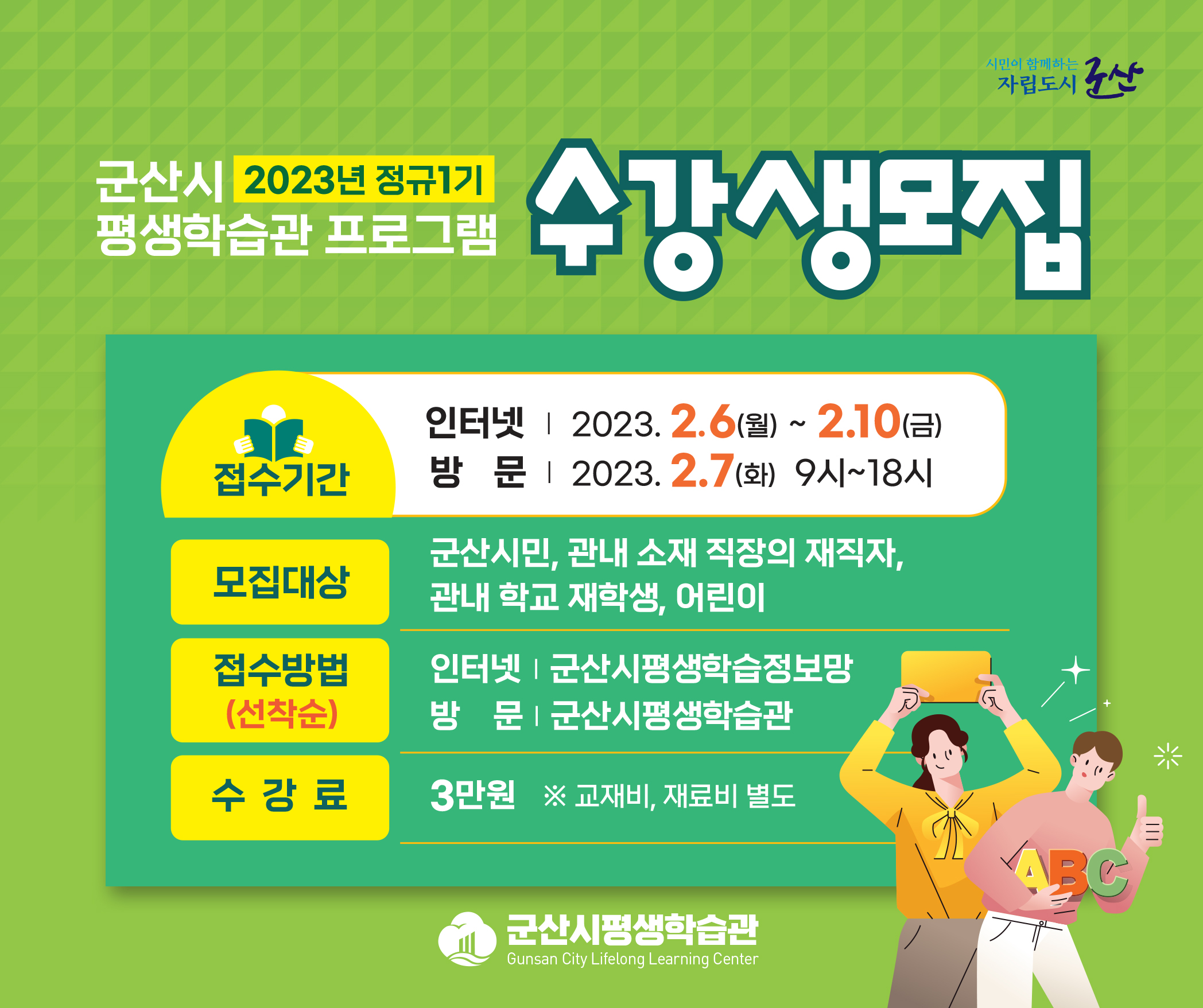 □ 접수방법 : 선착순 인터넷(군산시평생학습정보망) 및 방문(평생학습관)
