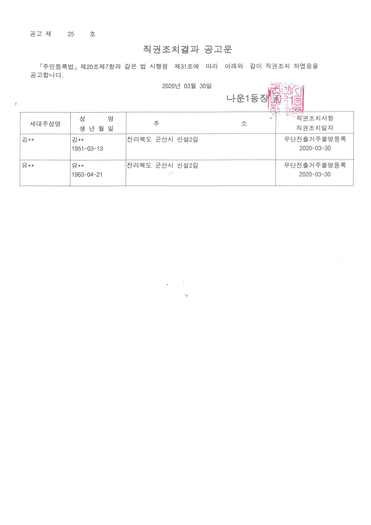 | 46 | 주민등록 신고 불이행자 직권조치 결과 공고 |