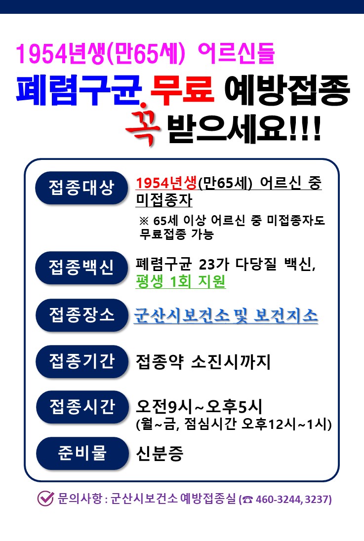 | 13 | 만65세(1954년 이전 출생)이상 어르신 폐렴구균 무료 예방접종 안내 |