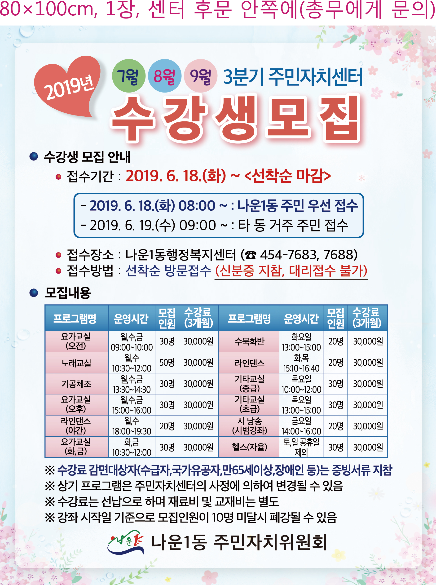 | 14 | 2019. 3분기 나운1동 주민자치센터 수강생 모집 안내 |