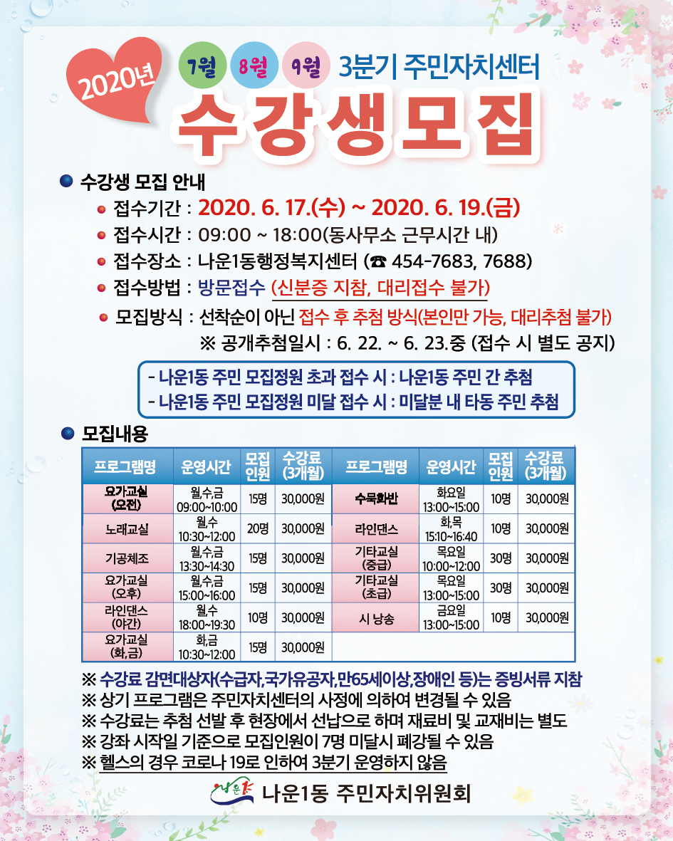 2020년 3분기 주민자치센터 프로그램 수강생 접수 안내입니다.