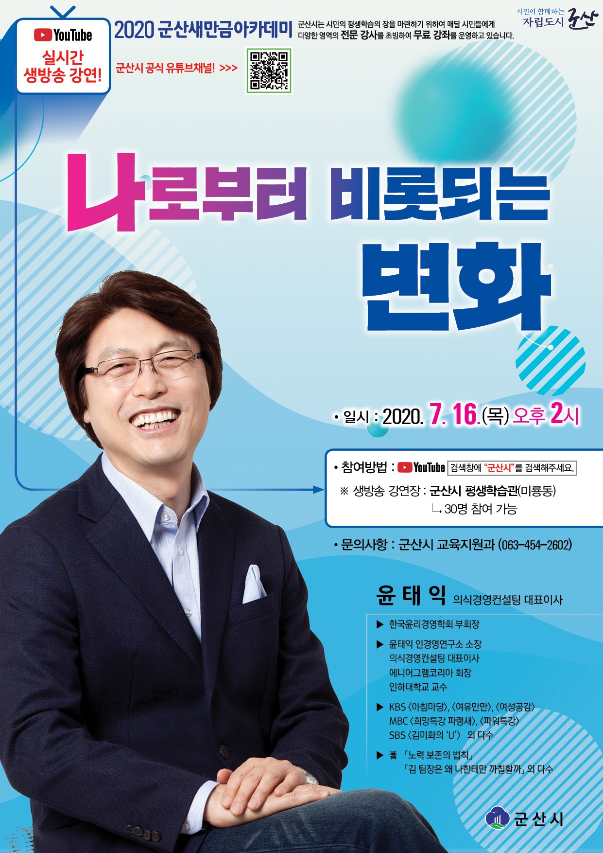 7월중 군산새만금아카데미는 코로나19예방을 위해 유튜브 온라인 생방송으로 진행하오니, 시민여러분의 많은 청취바랍니다.