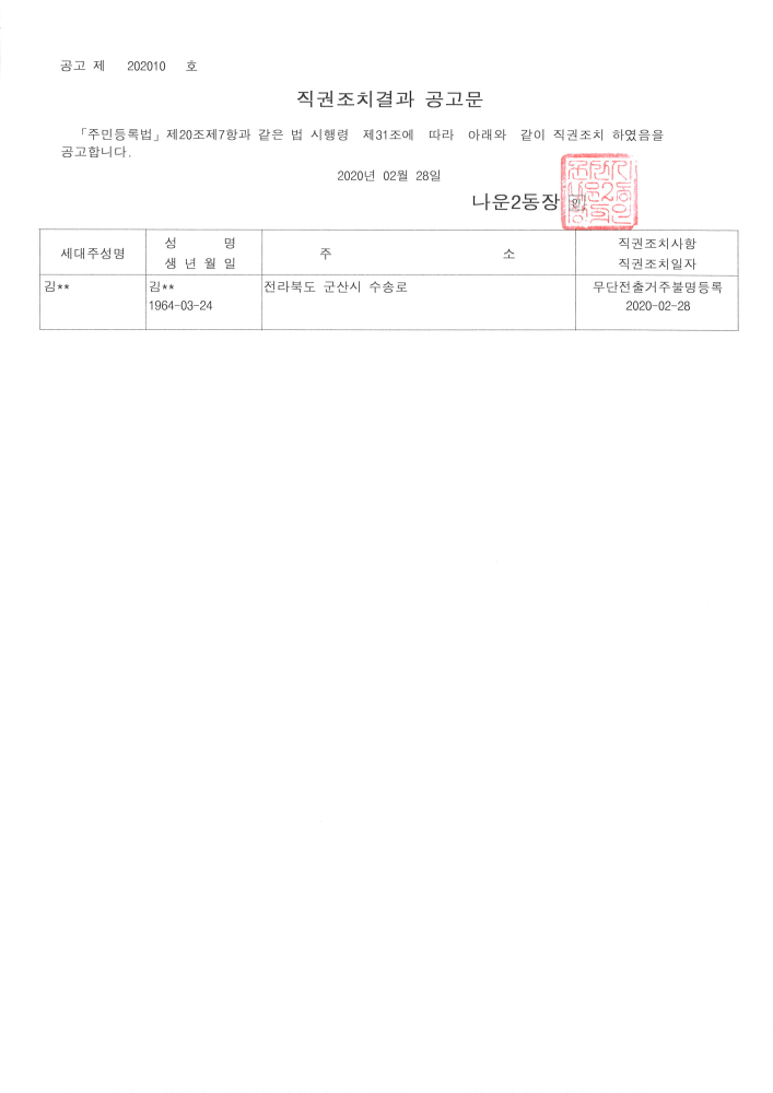| 48 | 주민등록 신고의무 불이행자 직권조치 결과 공고 |