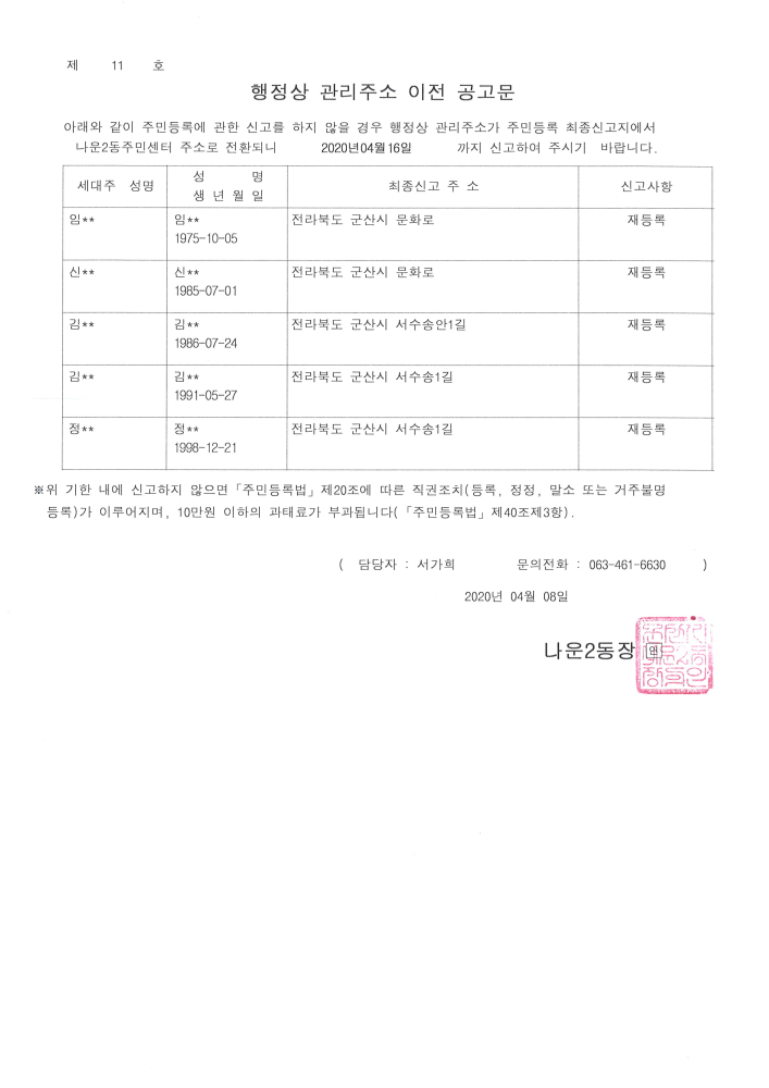 | 55 | 행정상 관리주소 이전에 따른 직권조치 결과 공고 |