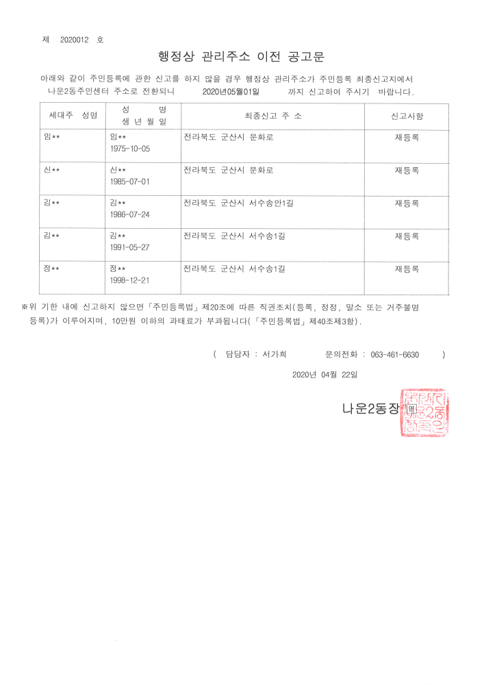 | 51 | 거주불명등록자 행정상 관리주소 이전 공고(2차) |
