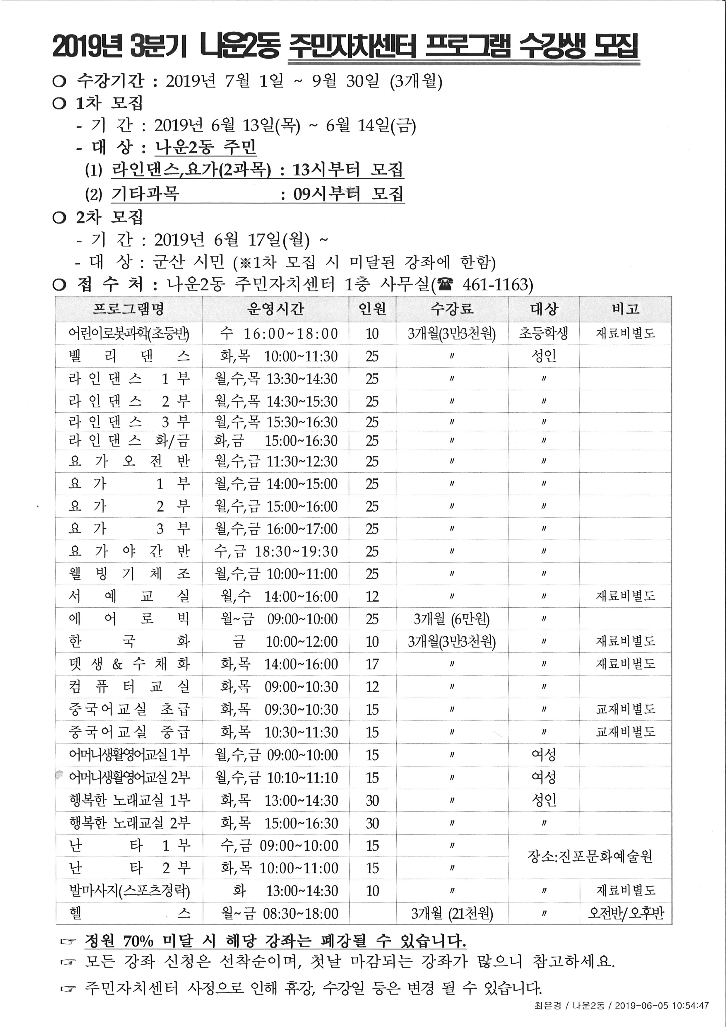 | 17 | 2019년도 2분기 나운2동 자치센터 프로그램 수강생 모집 |