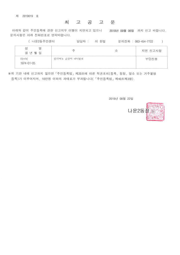 | 22 | 주민등록 신고의무 불이행자 최고공고 |