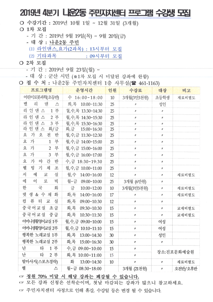 | 23 | 2019년 4분기 나운2동 주민자치센터 프로그램 수강생 모집 |