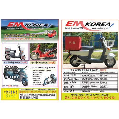 (주)이엠코리아에서 특허 기술고 개발한 전기 이륜차를 소개 합니다 . 저의 회사에서는 속도와 등판이 낮은 문제를 해결 하였습니다. 속도 65~70KM/h 등판 20~25도 월 5천원 미만의 경제적 유지비로 출퇴근 등학 순찰 방문영업 (우편 ,치킨,피자)등 각졷 배달을 친환경적으로 해결 할수 있습니다. 전국적으로 각 지역별 대리점을 모집 중입니다. 1) 고유가시대 한달 전기세 5천원 미만으로 뛰여난 경제성이 있습니다. 2) 다양한 용도로 안전하게 사용할수 있습니다. 3) 특허 기술 제품으로 무공해 ,무소음 친환경 제품입니다. 4) 국가 정책에 부응하는 녹색 선진화 사업입니다. 5) 다양한 모델과 생상으로 소비자 기호를 충족 할수 있습니다. 6) 사업 초보자도 쉽게 참쳐 하실수 있는 사업입니다. 최소 투자로 얻는 최고의 수입 !확실한 지역권 보장으로 안정적인 사업 보장! 실천하는 당신이 실속있는 애국자 이고 환경 운동가 입니다.