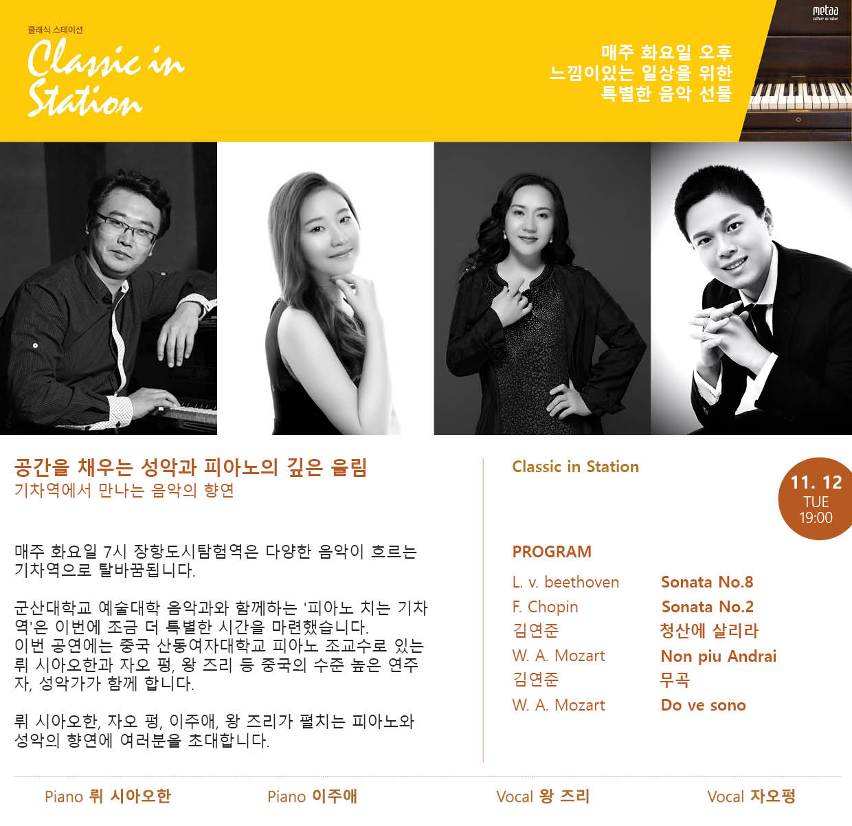 이번 공연을 특별히 중국의 연주자, 성악가 분들을 모시고 진행합니다. 중국 산동여자대학교 피아노 조교수로 있는 뤼 시아오한과 자오 펑, 왕 즈리 등 중국의 아티스트들과 이주애 피아니스트로 이번 공연이 꾸려집니다. 중국의 수준 높은 아티스트와 함께하는 “피아노 치는 기차역” 많은 관람 부탁드립니다.
