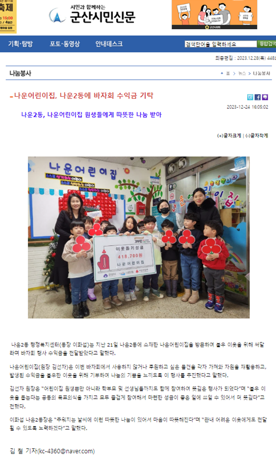 | 211 | 나운어린이집, 나운2동에 바자회 수익금 기탁 |
