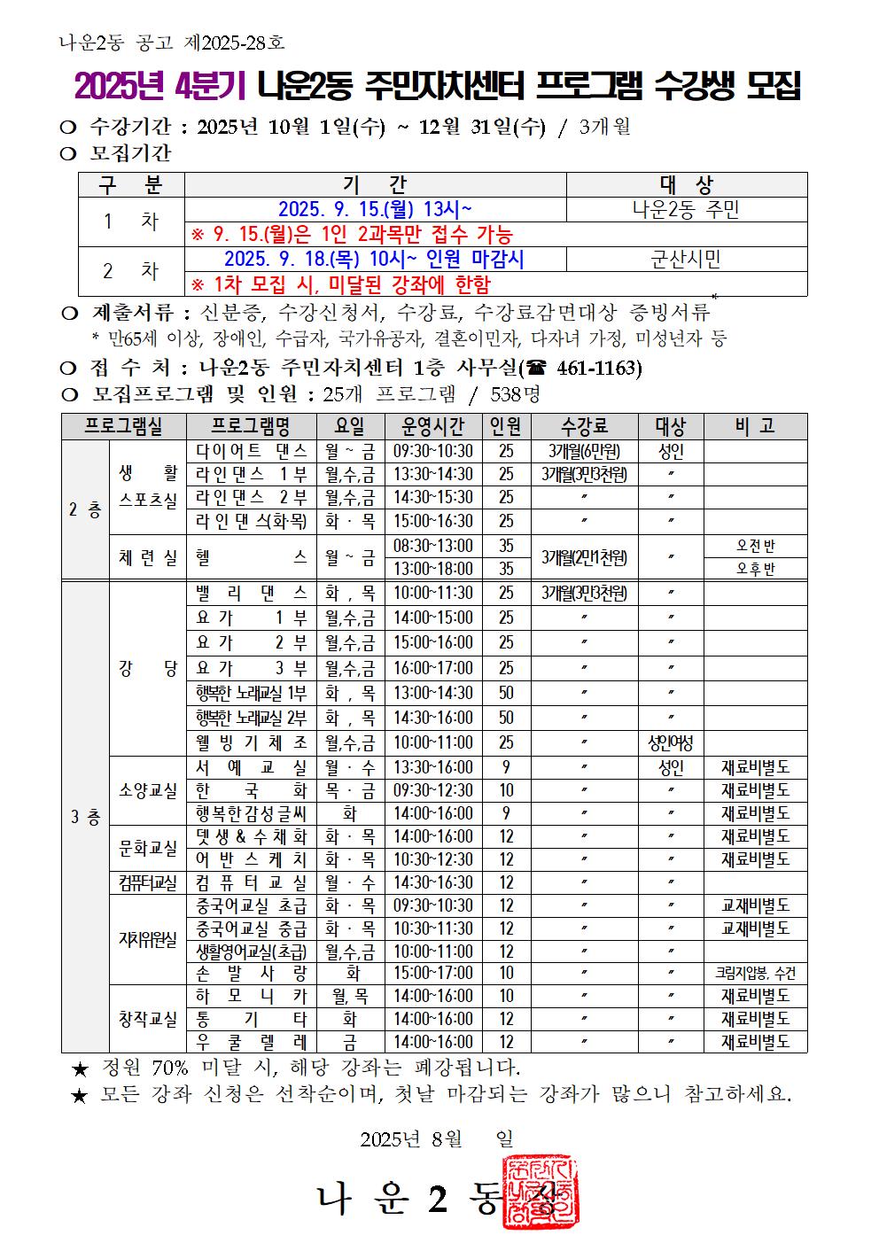 2025년 4분기 나운2동 주민자치센터 수강생 모집안내 공고문 및 수강신청서를 붙임과 같이 게시하오니, 관심있는 시민들의 많은 관심 부탁드립니다.