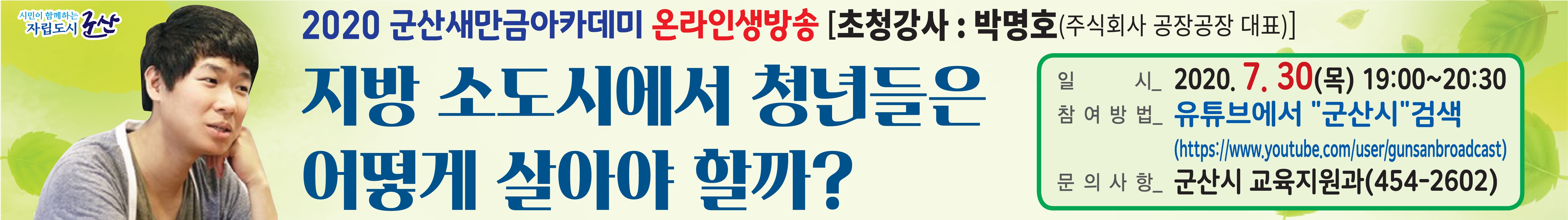 7월중 군산새만금아카데미는 코로나19예방을 위해 유튜브 온라인 생방송으로 진행하오니, 시민여러분의 많은 청취바랍니다.