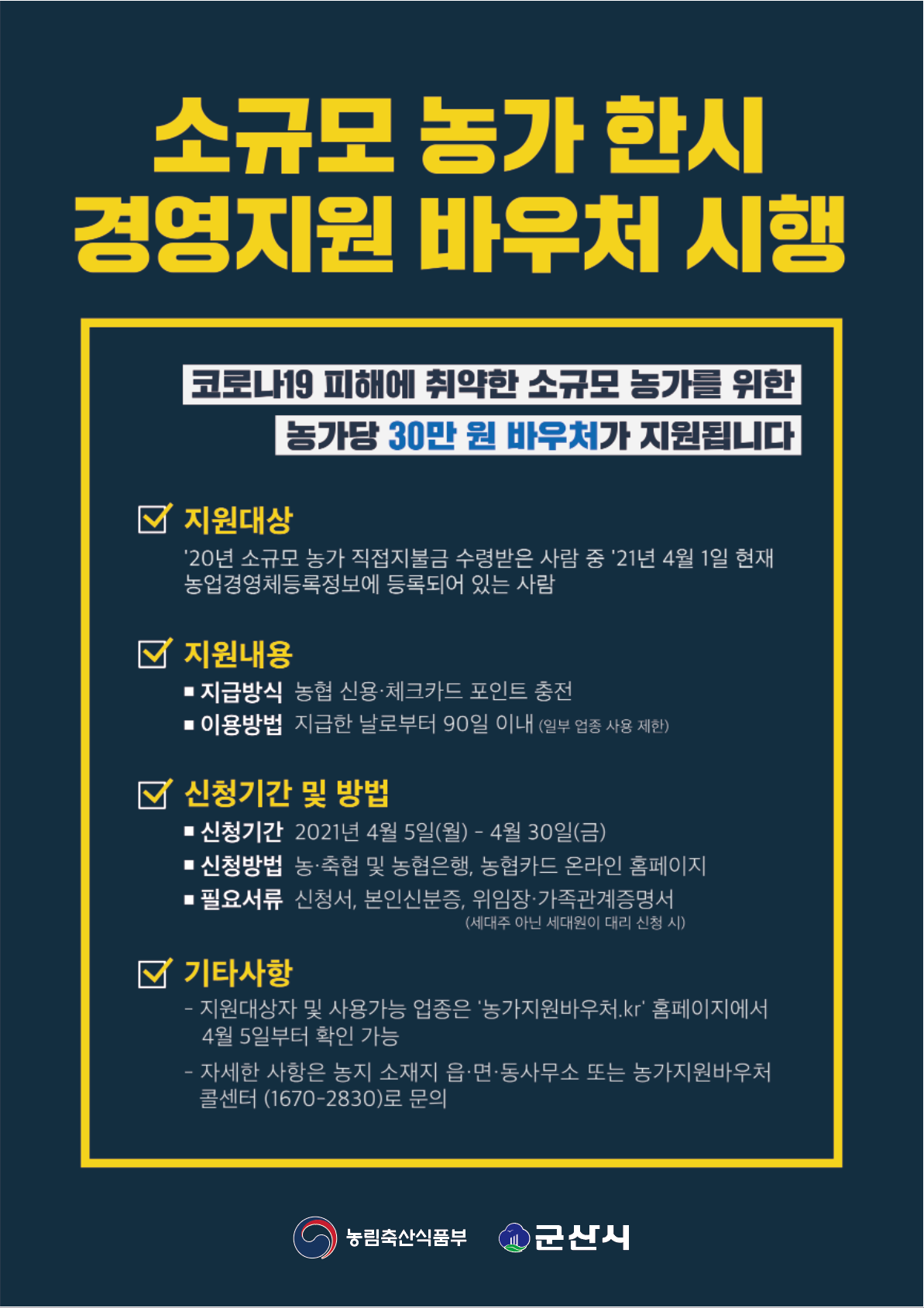 | 390 | 소규모 농가 한시 경영지원 바우처 시행(농가당 바우처 30만원) |