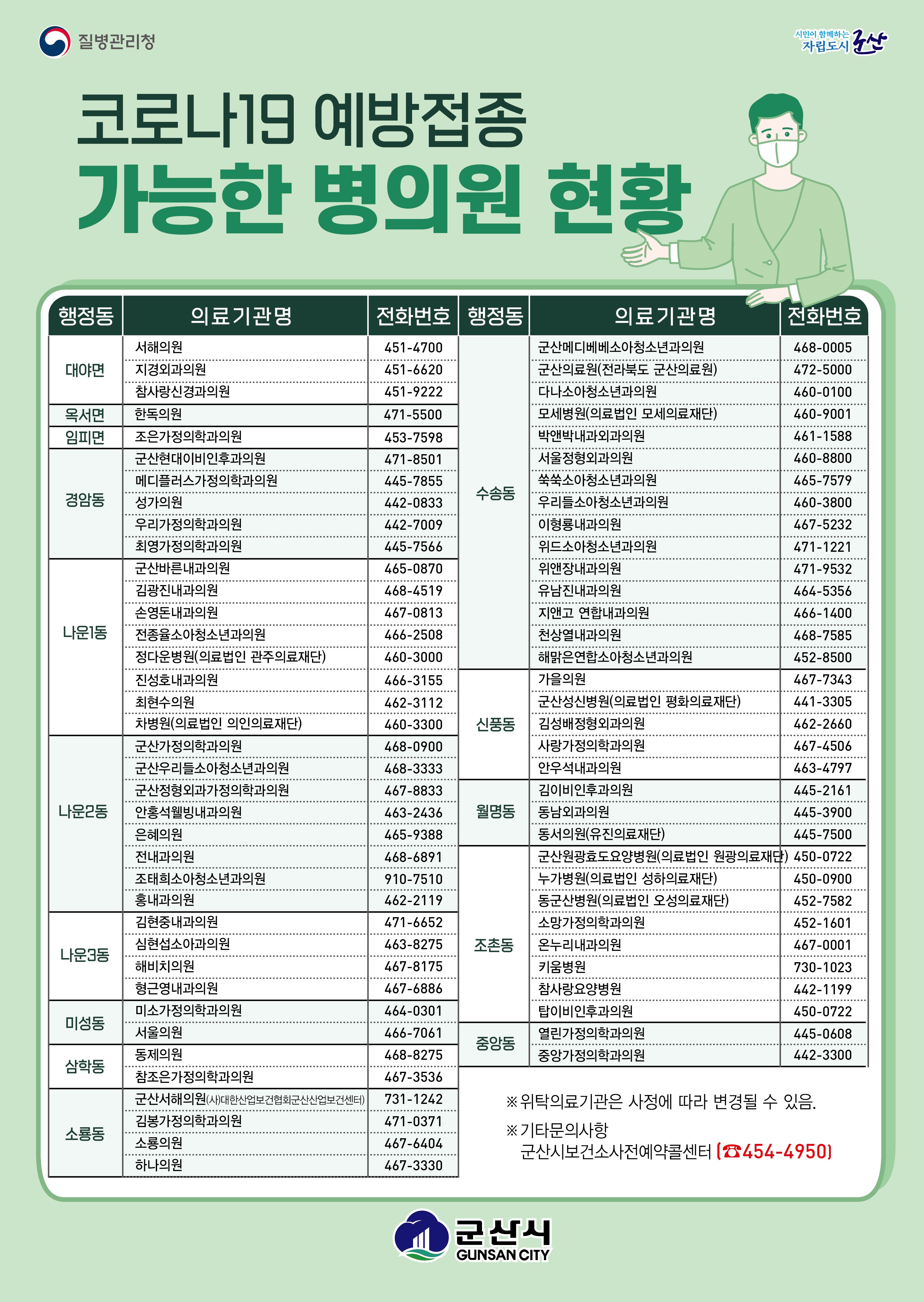 - (전화예약) 중앙(☏국번없이 1339), 보건복지부 복지상담센터(☏국번없이 129), 군산시보건소(☏063-454-4950)