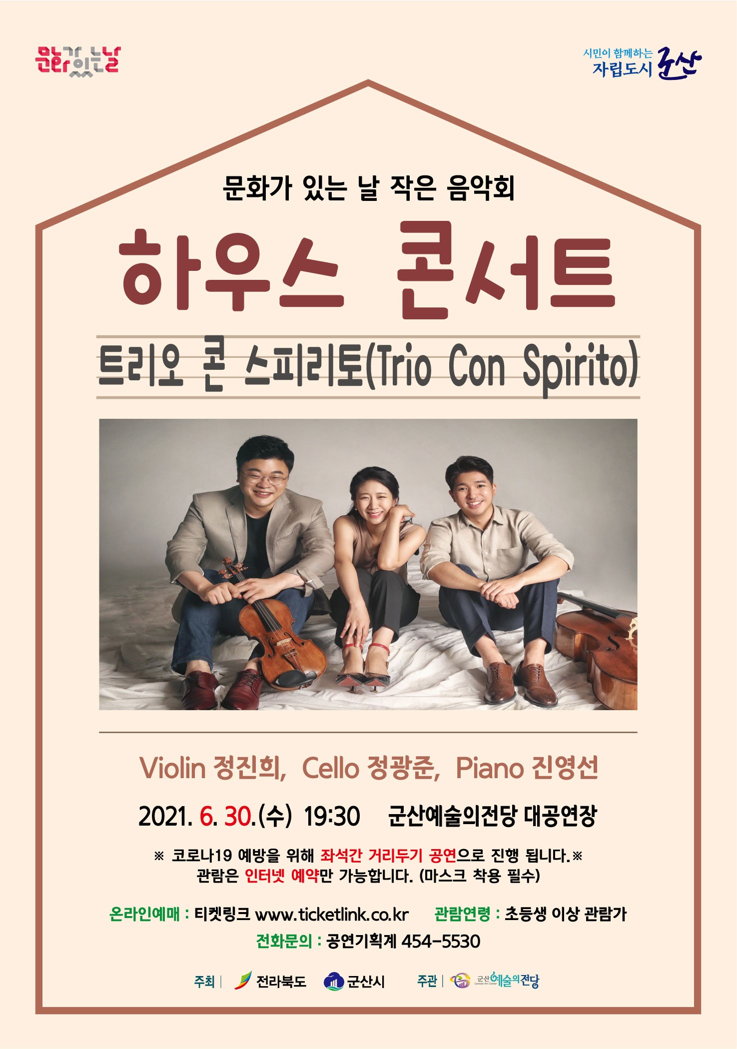예술의전당 기획공연 "하우스콘서트「트리오 콘 스피리토」" 이 다음과 같이 개최되오니, 직원 및 청사를 방문하는 시민들이 관람할 수 있도록 홍보에 협조하여 주시기 바랍니다.