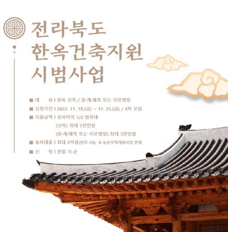 2022년 한옥건축지원 시범사업 대상자 4차 모집 공고가 있어 붙임과 같이 알려드립니다.