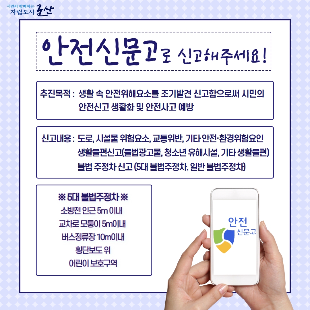 이와 관련하여 안전신문고 운영내용과 군산시민 안전보험 자동가입 사항을 붙임과 같이 안내합니다.