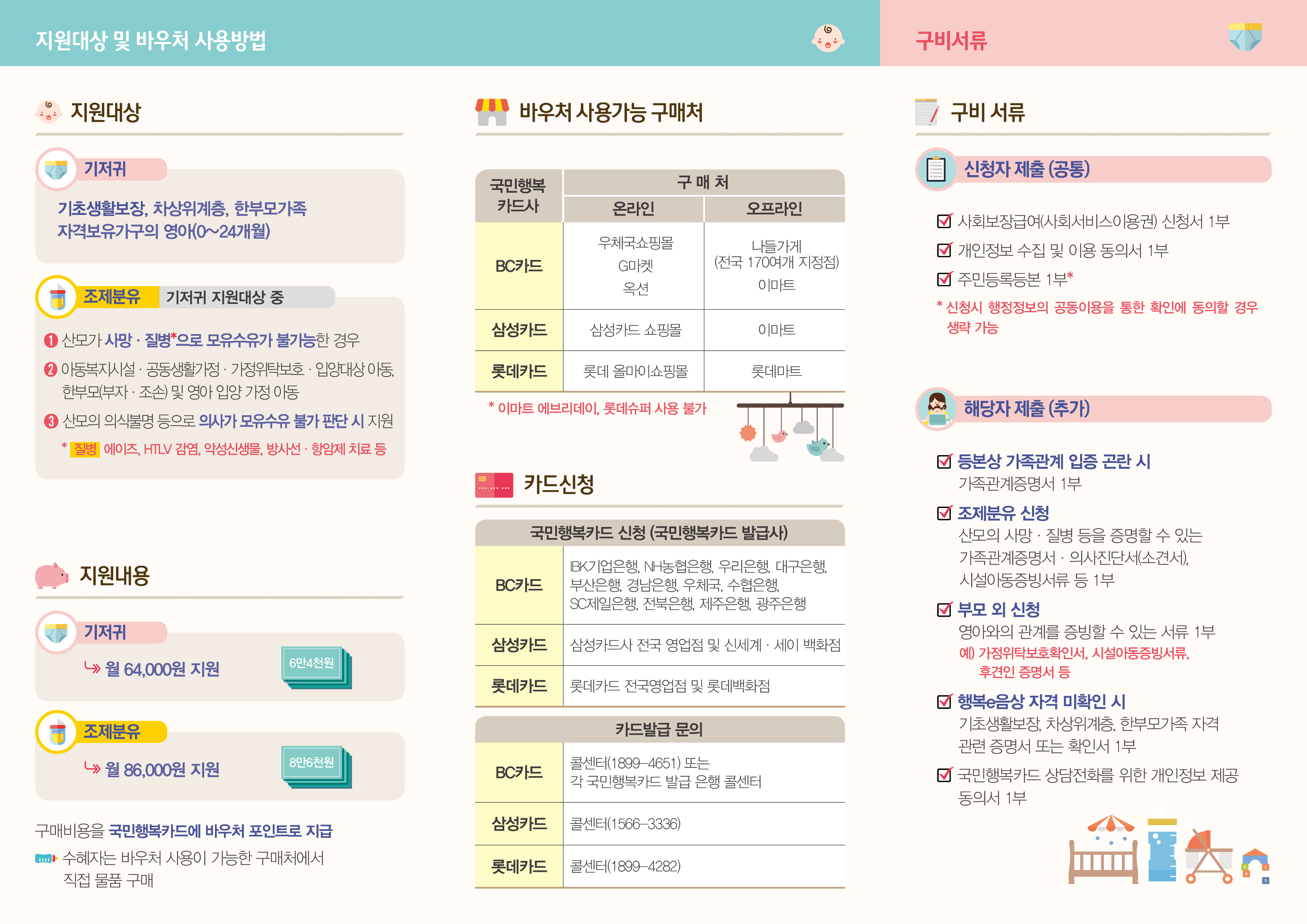 - 기초생활보장, 차상위, 법정 한부모가족 수급권자 인 경우, 영아별로 지원