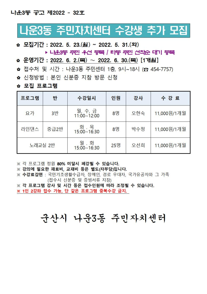 | 19 | 2026년 나운3동 주민자치센터 프로그램 강사 공개채용 공고 |